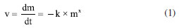 A general observation of the results in Figure 1 shows evident practically linear weight loss with exposure time and a similar progression pathway of cumulative weight losses for all the samples. This linear weight loss behavior observed for 1020 steel in hydrochloric acid solutions is reported in several studies.33-39 However, those studies generally evaluate the efficiency of new corrosion inhibitors and, therefore, the analysis of the results from the observed kinetic point of view is often omitted or not done. According to the weight loss results (Figure 1), it is proposed a zero-order kinetics mechanism to the 1020 carbon steel corrosion in HCl medium. Thus, by making x = 0 and integrating Equation 1, , the Equation 3 is obtained. ![]() Therefore, by plotting Δm as a function of t a straight line must be obtained, whose slope is equal to the reaction rate constant, k, of the corrosive process. The difference between the initial and final weights was used to measure the weight loss during each interval period. Figure 2 shows the experimental results of weight loss adjusted to the proposed zero-order kinetic model (for a more detailed analysis, see the Supplementary Material). The module values of the correlation coefficients (|R|), rate constants (k) and their respective standard deviations (SD) are shown in Table 2. As can be seen, the experimental data could be perfectly described by the zero-order kinetic model, with correlation coefficients not less than 0.994.