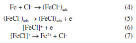 Fernando C. OliveiraI; Almir Silva NetoI I. Departamento de Metalurgia e Química, Centro Federal de Educação Tecnológica de Minas Gerais, 35180008 Timóteo - MG, Brasil Received: 11/13/2024 *e-mail: renata_seara@yahoo.com.br This study investigates the corrosion mechanism of 1020 carbon steel in strong acid solutions, relevant for industrial applications, using simple and effective laboratory methods. Direct (weight loss) and indirect (pH, ionic conductivity, open circuit potential and polarization curves) negotiations were performed to evaluate the corrosion rate in different concentrations of hydrochloric acid (HCl) and nitric acid (HNO3). In the HCl system, zero-order kinetics were confirmed (k = 10-5 min g-1), indicating a bottleneck in the corrosion mechanism, confirmed by electrochemical tests and metallographic analyses that showed uniform corrosion. In the HNO3 system, corrosion had first-order kinetics in the first 60 min (k = 10-2-10-3 min g-1), followed by passivation of the steel surface due to the presence of nitrate ions. These findings are particularly relevant for the acid pickling industry, where HCl is more stable, while HNO3 accelerates corrosion, requiring additional regulations. The results obtained are useful for the development of corrosion control and prevention strategies, contributing to increase the durability of materials and optimize the efficiency of industrial processes. INTRODUCTION Corrosion is a process in which the loss of essential properties of material (deterioration) occurs as a result of its chemical or electrochemical interaction with the environment.1-4 This process may compromise the mechanical and physical properties of equipment with serious economic5-8 and environmental impacts in all infrastructure sectors,9,10 such as roads, oil and gas pipelines,5-8 construction and water and sewage systems,11-13 causing severe damage and threats to public safety and health.14-17 In spite of remarkable advancement in the field of corrosion science and technology, the phenomenon of corrosion remains a major obstacle for industries all over the world.18,19 Though corrosion can be controlled by adapting suitable methods and highly corrosion-resistant materials, it accounts for additional expenditure. Thus, industries prefer the use of cheap metallic materials along with a suitable protection method, and the method selected for this purpose is based on its cost and performance in the field.19 Carbon steel (CS), due to its mechanical properties and low cost, is widely used in desalination plants, construction materials, pharmaceutical industry, thermal power plants, plating industries, oil refineries, automobiles, etc. The vast majority of steels used in pickling belong to the class of low carbon steels. In addition to carbon, these steels contain other alloying elements, such as Cu, Ni, Cr, Si and Ti, which can influence the pickling process. The magnitude of this influence varies according to the concentration of each of these elements in the steel. In general, the levels of these elements are low and, with some approaches, they exert little or no significant influence on the pickling time, depending on the element in question.19-21 In addition, CS has good mechanical and metallurgical properties which are essential for its fabrication for different applications.21 However, this material has low corrosion resistance, reducing the performance and useful life of engineering products. Therefore, it is necessary to apply methodologies that act against the corrosion process, for instance pre-treatments and corrosion inhibitors application.19-21 Excessive corrosion attack is known to occur on carbon steel surfaces deployed in service in aqueous acidic environments. Carbon steel is susceptible to different forms of corrosion inducted by chloride and so on.22,23 Hydrochloric and nitric acids are the most difficult to handle among common acids from the standpoints of corrosion and construction materials.24,25 Extreme care is required in the selection of materials to handle acids, even in relatively dilute concentrations or in process solutions containing appreciable amount of these acids. These acids are very corrosive to most of the common metals and alloys.24 Mild steel also finds an application for packaging in fluid industries, but its usage in acidic environments is restricted because of its susceptibility towards corrosion. Acid pickling is a technique frequently used to remove impurities and oxides from metal surfaces, and is essential in steel manufacturing processes and in industrial equipment maintenance operations. However, the application of strong fatty acids, such as HCl and HNO3, can cause accelerated manipulation of carbon steel, limiting its durability and operational efficiency. The pickling process consists of passing the strip through tanks containing acid, usually hydrochloric, although sulfuric, hydrofluoric and nitric are also used, with a temperature of around 80 ºC in the acid bath.25,26 HCl and HNO3 have an advantage over the other mineral acids in the acidification operation because it forms metal chlorides and nitrates, which are very soluble in the aqueous phase.26 However, the presences of chloride, sulfate and nitrate ions in aqueous media are particularly aggressive and accelerate corrosion.27 Knowing the reaction kinetics of these processes allows a more effective choice of method to combat corrosion. Reaction kinetics is the study of rates of the chemical processes and includes investigations of how different experimental conditions can influence the speed of a chemical reaction and yields information about the mechanism of the reaction and transition states, as well as the construction of mathematical models that can describe the characteristics of a chemical reaction.28 The rate of weight loss for a metal or alloy in the corrosion process can be described by Equation 1: ![]() where: v is reaction rate, m is mass, t is time, x i