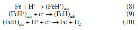 According to Figure 3b, the pH of the solution increased for all studied concentrations during the time that the steel sample was under attack by the medium. These results are compatible with steps 8 and 10 of the proposed kinetic mechanism. Step 8 provides the initial consumption of H+ ions due to their adsorption on the steel surface, (FeH+)ads. In step 10, (FeH)ads reacts with a free H+ ion generating molecular hydrogen. This proposed mechanism is compatible with the fact that the corrosion speed will be governed by the steel exposure area,42 which in this study was quickly saturated. Therefore, the corrosion to be observed must be uniform. Uniform corrosion is characterized by corrosive attack proceeding evenly over the entire surface area.40,41 This last aspect of 1020 carbon steel corrosion in HCl medium could be verified from the microstructural analysis of the samples. According to Figure 4a, a typical feature of these polarization curves was that the hydrogen evolution reaction (cathodic curve) was remarkably accelerated by increasing the HCl concentration. Figure 4b demonstrates that, for different concentrations of HCl, after 15 min, the potential values evolved towards stabilization.