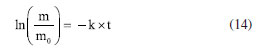 This exponential decrease in weight sample can be attributed to the mechanism of mild steel dissolution in a typical mineral acid, following a direct reduction of the hydrogen ions on the metal surface, which dissolution rate of this metal at the anodic site depends on the cathodic reaction, which can be summarized as shown in Equations 8-10. Therefore, a first-order kinetic model was assigned to this reaction stage. The second stage was the surface passivation initiation phase by nitrate ions45 which can be summarized as shown in Equations 11-13. ![]() Under such conditions, the primary oxidized products were in the form of various iron oxides (Fe2O3, Fe3O4, a-FeOOH, b-FeOOH, c-FeOOH, etc.), which decreased the rate of electron transfer.44,45 Therefore, it is characterized by a decrease in weight loss of sample, which started from 60 min of exposure until 180 min of exposure observed. According to the weight loss results, first-order kinetics is proposed and, thus, by making x = 1 and integrating Equation 1, ![]() Therefore, plotting ln(m/m0) as a function of t should provide a straight line whose slope is equal to the reaction rate k of the corrosive process. Figure 6 shows the experimental results of weight loss adjusted to the first-order kinetic models (for a more detailed analysis, see the Supplementary Material). The module values of the correlation coefficients (|R|), the rate constants (k) and their respective standard deviations (SD) are shown in Table 4.