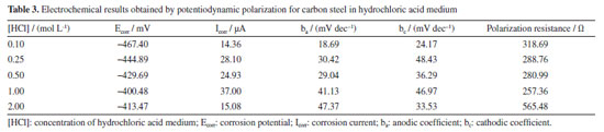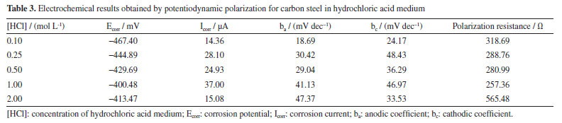 Table 3 illustrates the electrochemical results obtained from the potentiodynamic polarization curves recorded for carbon steel in hydrochloric acid. It is noted that at the highest concentration, HCl 2.00 mol L-1, there was a substantial increase in polarization resistance. This phenomenon is attributed to high concentrations of cathodic hydrogen, as illustrated in step 8, where the metal surface quickly becomes saturated due to the adsorption of these ions on the metal surface.