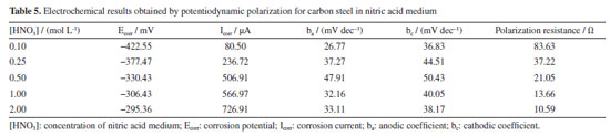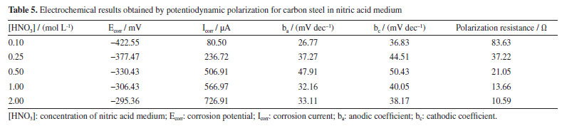 Table 5 illustrates the electrochemical results obtained by potentiodynamic polarization for carbon steel in nitric acid. It is observed that with the increase in nitric acid concentration, there is a reduction in polarization resistance, which is quite comparable to the results obtained by the previously discussed techniques. The corrosion current (Icorr) increases with the concentration of HNO3, especially in the first minutes of exposure, indicating rapid and active corrosion. For concentrations between 0.10 and 0.50 mol L-1, Icorr rises from 80.50 µA at 0.10 mol L-1 to 506.91 µA at 0.50 mol L-1, suggesting an accelerated initial corrosion process. For concentrations between 1.00 and 2.00 mol L-1, Icorr reaches 726.91 µA at 2.00 mol L-1. However, mass loss data indicate that the formation of a passive layer occurs after this period of intense corrosion, reducing the progression of corrosion in the longer term. The corrosion potential (Ecorr) shifts to less negative values as the concentration of HNO3 increases. This shift, from -422.55 mV at 0.10 mol L-1 to -295.36 mV at 2.00 mol L-1, initially indicates a higher corrosion tendency driven by increased H+ and NO3- ions. However, this movement toward less negative potentials can also be related to surface stabilization of the steel as the passive layer forms, indicating a reduction in the reactivity of the metal surface.44,45 Anodic coefficient (ba) shows an initial increase from 26.77 mV dec-1 at 0.10 mol L-1 to 47.91 mV dec-1 at 0.50 mol L-1, followed by a decrease at higher concentrations. This pattern reflects the onset of passive layer formation, which reduces the active dissolution rate of the metal and, thus, the current response to potential. Cathodic coefficient (bc) follows a similar behavior, suggesting that the reduction of H+ and NO3- ions is initially intense but, after passive layer formation, the cathodic reactions are limited due to reduced availability of reactive sites on the metal surface.