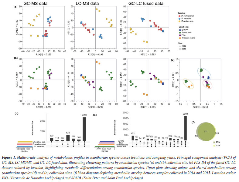 RESULTS AND DISCUSSION The metabolite expression of living organisms has been proposed as a valuable complementary tool in integrative systematics, connecting taxonomy to chemical signatures, but also allowing the understanding of some of the environmental drivers in chemically mediated interactions between the host and the microbiome.13-16 Although it has sparked controversy in recent years, there is increasing evidence that the metabolome may be divided into two main components: a core collection of metabolites related to primary metabolism and species-specific functions, and a dynamic collection of metabolites related to environmental conditions.17-19 Such division has also been proposed for the microbiome, which is, thus, reflected in the metabolome.20,21 Herein, 28 samples of zoantharians, Palythoa caribaeorum (n = 10), Palythoa variabilis (n = 10) and Zoanthus spp. (n = 8), collected at Brazilian oceanic islands during 2014 and 2015, were investigated using metabolomic tools. Crude extracts were partitioned to obtain apolar and polar fractions, which were analyzed by GC-MS and LC-MS/MS, respectively. Initially, data from apolar (GC-MS) and polar (LC-MS/MS) fractions were submitted to an exploratory principal component analysis (PCA) both separately and jointly, illustrating clustering patterns by zoantharian species (Figure 1a) and collection site (Figure 1b). There is a clear separation between samples from the two genera, Palythoa and Zoanthus, regardless of the analyzed fraction. However, LC-MS/MS seemed to have a higher discriminative power between the two groups, and fused data reinforced this pattern. GC-LC dataset was then analyzed by PLS-DA, highlighting metabolic differentiation among zoantharian species (Figure 1c). Most of the detected signals were shared by the three species (59.9%). In contrast, only a small fraction of the signals was species-specific for Zoanthus spp. (8.2%), P. caribaeorum (2.8%), and P. variabilis (2.6%) (Figure 1d). Shared signals between the two Palythoa species reached 15.7%.