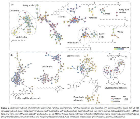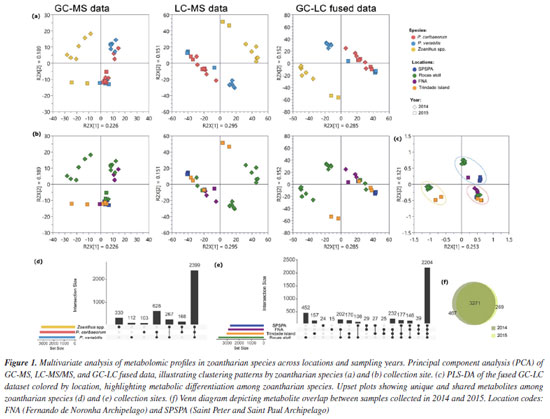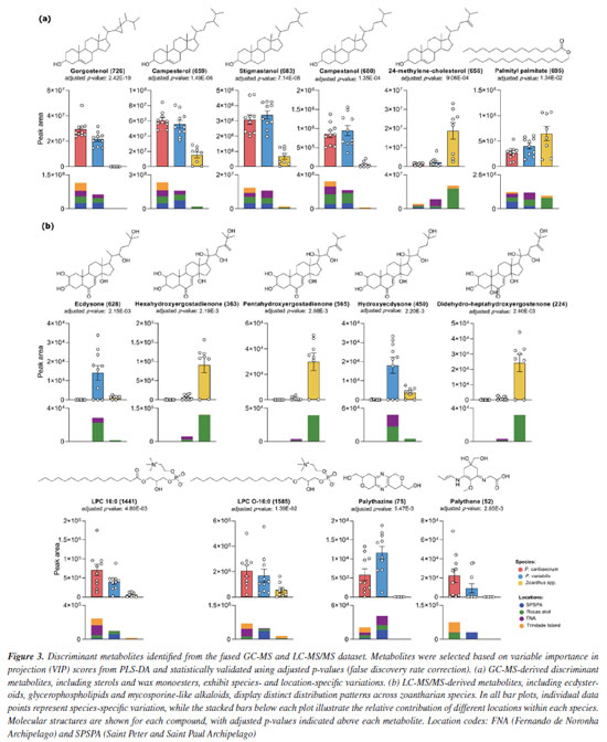 Bianca Del B. SahmI,II,# I. Laboratório de Farmacologia de Produtos Naturais Marinhos, Instituto de Ciências Biomédicas, Universidade de São Paulo, 05508-000 São Paulo - SP, Brasil Received: 03/10/2025 *e-mail: costalotufo@usp.br Zoantharians are benthic marine organisms widespread in Brazilian tropical shallow waters. Recent evidence suggests that the metabolism of these cnidarians may be influenced by diverse environmental factors. We have previously shown that two species of Palythoa found on the Brazilian coast share metabolomic similarities related to their location. Herein, through gas chromatography coupled with mass spectrometry (GC-MS) and liquid chromatography tandem mass spectrometry (LC-MS/MS) analysis, along with molecular networking, we assessed polar and apolar extracts from 28 samples of Palythoa spp. and Zoanthus spp. collected at different Brazilian oceanic islands - Saint Peter and Saint Paul Archipelago, Fernando de Noronha Archipelago, Rocas Atoll and Trindade Island - to describe and compare their metabolome in such isolated regions, under reduced interference of anthropic actions. The chemical profiles of zoantharians from Brazilian oceanic islands include fatty acids and sterol derivatives, in apolar fractions, and ecdysteroids, phospholipids, ceramides, mycosporine-like amino acids, and alkaloids in polar fractions. These chemical classes are similar to those described for the continental zoanthids, previously assessed. The results presented herein reveal a preserved metabolome across the analyzed species, Palythoa caribaeorum, Palythoa variabilis and Zoanthus spp., and between island and continental organisms, suggesting core species-specific metabolites and a portion of an environmentally-driven chemical expression. INTRODUCTION Zoantharians, also known as sea mat corals, are among the most common benthic marine organisms in Brazilian tropical shallow-water communities, including coral reefs. So far, thirteen different species have been reported in Brazil, where Palythoa caribaeorum, P. variabilis, and Zoanthus sociatus are among the most abundant ones.1 Both genera, Palythoa and Zoanthus, stands out not only for their abundance in marine ecosystems but also for their ability to biosynthesize secondary compounds with significant ecological and biotechnological potential.2-4 Data from reefs in the southwest Atlantic coast revealed that zoantharians, along with macroalgae, are organisms that rapidly occupy degraded areas where reef-building animals (such as scleractinian corals) have been lost,5 suggesting that these cnidarians are also important players in the community phase-shift process. In Todos os Santos Bay, for example, P. variabilis, accounts for up to 88.6% of shifted reef areas.6 This suggests that a high abundance of these animals does not necessarily indicate a healthy ecosystem, especially in coral reefs. Up to now, there have been no studies describing the chemical mediation of this coral-to-zoantharian shift. These characteristics make zoantharians relevant indicators of reef ecosystem health while also serving as a source of bioactive substances.7,8 Recent studies4,7,9,10 suggest that the metabolic profiles of these cnidarians may be influenced by a range of environmental factors, including temperature, salinity, and pollution, as well as by the composition of their associated microbiota. We have previously shown4 that two congeneric species of Palythoa found on the Brazilian coast share metabolomic similarities depending on the location in which they cohabit. Indeed, their chemical profile seems to be influenced by environmental variation and not only by specie-intrinsic specialized metabolism drivers. These changes in their metabolome serve as important cues as to the functional role of the microorganisms for acclimation or adaptation to variable environmental regimes. Hence, this dynamic reflects a complex balance between endogenous (organism-intrinsic) and exogenous (external) factors, which together can shape the adaptive capacity of Palythoa.4 Metabolomic approaches have proven to be valuable tools for characterizing the chemical variability of marine organisms, enabling the elucidation of adaptive mechanisms crucial for survival in challenging environments. Furthermore, this methodology has been effective in microbial identification, contributing to a deeper understanding of the symbiotic interactions that define these marine holobionts.11,12 Moving away from the coastline, the objective of this study is to assess the metabolomic profile of zoantharians holobionts found in Brazilian oceanic islands (Palythoa caribaeorum, P. variabilis and Zoanthus spp.), adding data to the significant variations in the metabolic profiles of zoantharians from coastal and isolated island environments. With the possible exception of Fernando de Noronha Archipelago, the Brazilian oceanic islands may be considered more pristine ecosystems, where the influence of natural environmental variations may be perceived with less interference from anthropic actions. Furthermore, to the best of our knowledge, this is the first metabolomic assessment of zoantharians found in the four Brazilian oceanic islands, which brings a valuable contribution to knowledge about the species. Through this analysis, we aimed to identify the chemical composition of these organisms from isolated regions, contributing to a better understanding of zoantharian adaptations and their responses to ecological changes. This research may provide valuable insights into the health of reef ecosystems and the roles of zoantharians in biodiversity conservation.