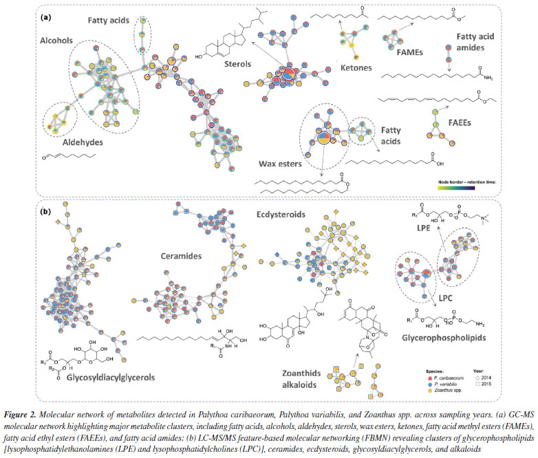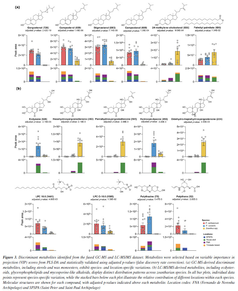 CONCLUSIONS The chemical diversity of zoantharians from Brazilian oceanic islands mostly includes fatty acids and sterol derivatives, as well as ecdysteroids, phospholipids, ceramides, mycosporine-like amino acids, and various alkaloids. These are, in general, chemical classes comparable to those previously described for the continental zoantharians collected along the Brazilian coast. The consistency of the metabolome in the different species analyzed herein, Palythoa caribaeorum, Palythoa variabilis and Zoanthus spp., and between island and continental organisms, suggests core species-specific metabolites and a dynamic fraction of environmentally driven chemodiversity.