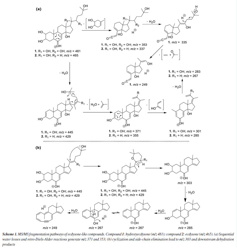 Scheme 1b shows the ions that rapidly eliminate the entire side chain, resulting in fragment ions of identical m/z for both compounds 1 and 2. The process is initiated by the loss of a water molecule from the beginning of the side chain, although additional neutral water losses may occur beforehand. A nucleophilic attack by the terminal -OH group on the unsaturation leads to a cyclization, forming a six-membered ring that immediately undergoes elimination of the entire cyclized side chain via a remote hydrogen rearrangement mechanism, generating the ion at m/z 303 in both structures. This ion then loses two additional water molecules through the previously described mechanism, and a third water molecule is eliminated upon ring opening, forming an alkyne - a process similar to that observed in sesquiterpene lactones.29 These fragmentation patterns further supported the propagation of structural annotations across the ecdysteroid cluster. Ecdysone and hydroxyecdysone differ by +16 Da, as shown in Scheme 1, consistent with the addition of a hydroxyl group on the side chain. Dihydroxymethylecdysone, which exhibited a +30 Da shift relative to hydroxyecdysone, produced the characteristic fragment at m/z 371, indicating that the modification is localized on the side chain. In contrast, acetyl-hydroxyecdysone showed a +42 Da shift and generated a fragment at m/z 413, while the presence of m/z 353 suggests that acetylation occurs on the steroid core. These compounds represent illustrative examples of the ecdysteroid-like family, with comparative MS/MS spectra shown in Figure 8S (Supplementary Material). Statistical analysis further supports a distinction between the two zoanthids studied genera, demonstrating that Zoanthus species differentiate from Palythoa species, and wax monoesters appear in slightly higher abundance in Zoanthus spp. Figure 3a showed that Palythoa species have a predominance of phytosterols, such as gorgosterol, campesterol, stigmasterol and campestenol, while Zoanthus spp. showed the predominance of 24-methylene-cholesterol and palmityl-palmitate. These results reinforce the genus-specific chemical signatures and suggest functional or ecological roles for these compounds, possibly related to structural integrity, environmental adaptation, or symbiotic interactions.31 The recurrence of these lipidic profiles across studies further underscores the stability and relevance of these metabolites within zoantharians, providing valuable insights into their biochemical and metabolic characteristics.
