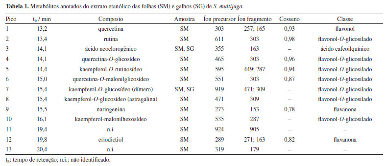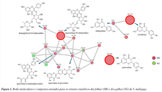 PARTE EXPERIMENTAL Material vegetal Folhas e galhos de S. multijuga foram coletados no campus Uvaranas da Universidade Estadual de Ponta Grossa (25º5'23"S 50º6'23"O). A espécie foi identificada pela Profa. Dra. Rosângela Tardivo, depositada no herbário da UEPG (HUPG 21655) e registada no Sistema Nacional de Gestão do Patrimônio Genético e Conhecimento Tradicional Associado (SisGen) sob o número A7481FE. Obtenção dos extratos brutos As folhas (6,0 g) e galhos (20 g) de S. multijuga foram secos e triturados em moinho analítico. O pó obtido (5,25 g de cada amostra) foi levado para extração com 125 mL de etanol grau P.A. em banho ultrassônico (Elmasonic S 60 H) com frequência de 37 kHz a 40 ºC por 45 min. Em seguida, os extratos foram filtrados e submetidos à destilação sob pressão reduzida em um evaporador, em banho a 40 ºC. Pré-purificação dos extratos Os extratos foram submetidos a uma pré-purificação no intuito de se remover o excesso de clorofila. Para isso, 5,0 mg dos extratos brutos provenientes de folhas e galhos foram solubilizados em 3,0 mL de metanol (MeOH) grau HPLC e submetidos à extração em fase sólida em cartucho contendo 500 mg de C18, com diâmetro de partícula de 40 mm, marca Phenomenex. O processo de eluição foi realizado com 3,0 mL de uma mistura de água e 0,1% de ácido fórmico (CH2O2) (solvente A) e uma solução de metanol e 0,1% ácido fórmico (solvente B), variando-se a proporção do solvente B em 0, 95 e 100%. Análise por cromatografia líquida acoplada a um analisador de massas de baixa resolução (LC-ESI-IT-MS) Os extratos obtidos foram analisados por meio de cromatógrafo líquido (Shimadzu®) acoplado a um espectrômetro de massas AmaZon-SL (Bruker Daltonics®). O sistema de cromatografia líquida operante nos seguintes módulos: bombas (LC-20AD), forno (CTO-20A), degaseificador (DGU-20A3R), módulo de comunicação (CBM-20A) e detetor de arranjo de diodos (SPD-M20A). A injeção de amostra (2 μL) foi realizada por meio de um injetor automático (SIL-20A HT). Os solventes utilizados nas análises foram de grau HPLC. Os extratos secos foram solubilizados em MeOH grau HPLC a 1 mg mL-1 e analisados por cromatografia líquida em fase reversa à temperatura de 35 ºC, com uma coluna Phenomenex Luna C18, de dimensões de 250 × 4,6 mm, partículas de 5 μm e poros de 100 Å como fase estacionária, e a fase móvel foi constituída por solução A: H2O (0,10% CH2O2) e solução B: ACN (0,10% CH2O2). A eluição foi realizada com um gradiente exploratório de 5-100% de solvente B com vazão de 1 mL min-1 em 45 min. Os espectros de massas foram adquiridos em modo positivo na faixa de aquisição de m/z 50-1500. Os parâmetros da fonte de ionização por electrospray (ESI) do espectrômetro de massas foram ajustados com voltagem de saída do capilar 140 V, voltagem do capilar de -3,5 kV, e temperatura de dessolvatação 300 ºC. Utilizou-se nitrogênio como gás de secagem e dessolvatação (7 psi, 4 L min-1). Os dados foram processados com o auxílio do software Data Analysis, versão 4.2 (Bruker, EUA, 2013). Processamento dos dados na plataforma Global Natural Product Social Molecular Networking (GNPS) Os dados brutos adquiridos no formato ".d" em modo positivo foram convertidos para ".mzML" utilizando o software Data Analysis, versão 4.2, e utilizados para gerar as redes moleculares. As redes moleculares foram criadas a fim de se verificar o perfil químico dos extratos etanólicos das folhas (SM) e galhos (SG) de S. multijuga, usando o fluxo de trabalho online no site do GNPS.18 Os dados foram filtrados removendo-se todos os íons fragmentos MS/MS dentro de +/-17 Da do precursor m/z. Os espectros de MS/MS foram filtrados por janela, escolhendo-se apenas os 6 principais íons fragmento na janela de +/-50 Da em todo o espectro. A tolerância de massa do íon precursor e dos íons fragmentos MS/MS foram ajustadas para 0,5 Da. Uma rede foi então criada, onde as arestas foram filtradas para se ter um valor de cosseno acima de 0,7 e mais de 6 sinais correspondentes. Finalmente, o tamanho máximo de uma família molecular foi definido como 100. Os espectros foram então pesquisados nas bibliotecas espectrais do GNPS. Todas as correspondências mantidas entre espectros de rede e espectros de biblioteca precisavam ter pontuação acima de 0,7 e pelo menos 6 sinais correspondentes. Os resultados obtidos podem ser acessados na plataforma do GNPS2.19 Atividade tripanocida O extrato etanólico das folhas de S. multijuga (SM) foi solubilizado em dimetilsulfóxido (DMSO) a 100 mg mL-1. Nos ensaios biológicos, a concentração final máxima de DMSO foi de 0,5%. Formas epimastigotas de Trypanosoma cruzi (cepa Y) foram mantidas a 27 ºC em meio LIT (liver infusion tryptose), suplementado com 10% de soro fetal bovino (SFB), através de dois repiques semanais. Todos os testes com epimastigotas foram realizados com parasitos coletados no quarto dia de cultivo. Para os ensaios de atividade tripanocida, 180 μL poço-1 de uma suspensão contendo 5 × 106 epimastigotas de T.cruzi mL-1 foram semeados em placas de 96 poços e incubados com 20 µL de SM nas concentrações de 5, 25, 50 e 100 µg mL-1 por 48 h a 27 ºC. Como controle, utilizou-se DMSO 0,5%. O percentual de inibição sobre o parasita foi estimado em microscópio invertido através da observação da redução da motilidade, mudança na morfologia e integridade dos parasitas, seguido da técnica colorimétrica do MTT (brometo de 3-(4,5-dimetiltiazol-2-il)-2,5-difenil tetrazólio).20,21 Brevemente, a placa foi centrifugada por 5 min a 4000 rpm, o sobrenadante foi descartado e, em seguida, foram adicionados 50 μL da solução 2 mg mL-1 de MTT em cada poço. Após 3 h de incubação a 37 ºC, a placa foi centrifugada a 4000 rpm por 5 min. O sobrenadante foi removido e o sedimento de parasitas foi suspenso em 20 μL de dodecilsulfato de sódio (SDS) 10% em HCl 0,01 M e 80 μL de DMSO por
