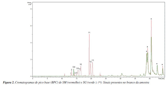 Foram anotados compostos cujo valor de cosseno fosse maior ou igual a 0,7 (Tabela 1), conforme definido nos parâmetros da análise. O parâmetro representa a similaridade espectral de MS/MS entre o espectro da amostra e os espectros presentes na biblioteca. Quanto mais próximo de 1, mais similares são os espectros.28 Foram anotados derivados O-glicosilados de quercetina, caracterizados pela presença do íon fragmento m/z 303, correspondente à sua aglicona. Para o íon precursor de m/z 465, sugere-se o composto quercetina-O-glicosídeo, cuja fragmentação evidencia a perda de uma unidade de hexose (162 Da), indicada pelo íon fragmento de m/z 303. Para a quercetina-O-rutinosídeo (m/z 611), foi observada a perda do dissacarídeo (hexose mais deoxihexose, 308 Da), gerando o íon fragmento m/z 303, característico da aglicona. Essa mesma perda (308 Da) foi verificada para o kaempferol-O-rutinosídeo, gerando então o íon fragmento de m/z 287, confirmando a presença deste flavonoide.29 Para a quercetina-O-malonilglicosídeo, a perda característica de malonilexose (-248 Da) originou o íon fragmento m/z 303, atribuído ao núcleo característico de um flavonol. Adicionalmente, a fragmentação dessa aglicona resultou na formação do íon m/z 257, relativo à perda de água e CO, um padrão típico desses flavonoides. Em seguida, observou-se o sinal de m/z 165, característico da reação retro Diels-Alder, devido à clivagem do anel C da quercetina.30 O íon precursor de m/z 289 foi anotado como eriodictiol, com base em suas fragmentações características, como a formação do íon fragmento de m/z 271 que ocorre devido à perda de água, enquanto o íon fragmento de m/z 163 resulta da retrociclização e clivagem do anel A, um comportamento típico dessa flavanona em espectrometria de massas.31 Para a naringenina (m/z 273), a fragmentação gerou o íon fragmento de m/z 153, que corresponde à perda da unidade C8H8O, relativa ao anel B, conforme descrito na literatura.32 Alguns compostos presentes nas redes moleculares não tiveram correspondência com aqueles disponíveis na plataforma GNPS. No entanto, por se tratarem de metabólitos já reportados na literatura, foi possível atribuir o padrão de fragmentação desses compostos a derivados do kaempferol, como a astragalina, cujo íon precursor [M + Na]+ foi observado em m/z 471. A perda da unidade glicosídica da astragalina gerou o íon fragmento em m/z 309 [M + Na]+. Foi possível atribuir o sinal em m/z 919 [2M + Na]+ ao íon precursor do dímero desse flavonol glicosilado, sendo possível observar os íons framentos em m/z 471, relativo ao monômero, e em m/z 309, atribuído a [M + Na]+ relativo à aglicona.33 O íon precursor de m/z 535 foi anotado como kaempferol-malonilhexosídeo, onde a perda da unidade malonilexose (-248 Da) originou o íon fragmento m/z 287, atribuído ao kaempferol.34 O sinal em m/z 355 [M + H]+ foi atribuído ao íon precursor do ácido neoclorogênico, onde a clivagem do éster leva ao cátion relativo ao ácido quínico em m/z 193.35 Com exceção da rutina, os demais metabólitos são mencionados pela primeira vez para S. multijuga. Na Figura 2 estão representados os cromatogramas de pico base (BPC) de SM e SG. No entanto, para que haja determinação inequívoca da estrutura dos compostos, são necessárias técnicas espectroscópicas e espectrométricas complementares para a caracterização química, como a ressonância magnética nuclear de 1H e 13C. Além disso, tendo em vista que não foi possível determinar a estrutura química relativa a dois sinais intensos observados no BPC de SM, o fracionamento desse extrato, visando elucidar a estrutura dos metabólitos que geraram os respectivos sinais, é importante.