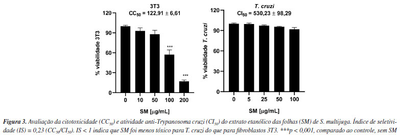 Flavonoides são fitoconstituintes abundantes em espécies do gênero Senna, podendo ser isolados de diferentes partes do vegetal.5 A rutina foi previamente isolada dessa espécie6 e foi o componente majoritário do extrato metanólico das folhas S. italica e S. alexandrina.36 Quercetina-O-glicosídeo e naringenina foram isoladas de S. macranthera e S. siamea, respectivamente.5 Mohamed et al.37 descreveram um efeito radioprotetor da combinação de rutina e naringenina, atribuído ao efeito de sequestro de radicais livres já descritos para essas substâncias. Visando aumentar sua biodisponibilidade, vários estudos demonstram a eficácia de nanoformulações de naringenina em estudos in vivo.38 Tendo em vista que os compostos anotados foram majoritariamente atribuídos ao extrato das folhas (SM), os ensaios de atividade tripanocida e antioxidante foram realizados com essa amostra. Atividade tripanocida e citotóxica SM não apresentou atividade tripanocida in vitro, sendo que as formas epimastigotas de T. cruzi (cepa Y) mantiveram taxas médias de viabilidade acima de 90% (Figura 3). Por outro lado, os fibroblastos da linhagem 3T3 foram mais sensíveis (CC50 = 122,91 µg mL-1), resultando em um índice de seletividade abaixo de 1, o que indica que SM foi mais citotóxico do que ativo contra o parasita (Figura 3). Contrariamente, o extrato hidroalcoólico de S. occidentalis não exibiu citotoxicidade significativa frente a esses fibroblastos, indicando a possibilidade de seu uso em formulações tópicas.39