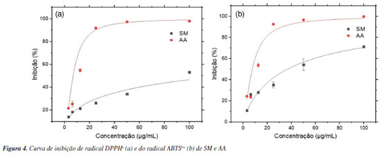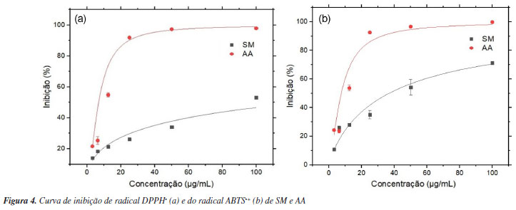 Os ensaios de captura de radical DPPH podem ter mecanismos antioxidantes diferentes, dependendo de fatores como efeito do solvente e pH, por exemplo. Etanol e metanol são parcialmente ionizantes e, por esse meio, a inibição pode ocorrer tanto por transferência de átomos de hidrogênio como por transferência de elétrons. Portanto, o radical DPPH reage com compostos antioxidantes por meio de transferência de elétrons com perda de prótons sequencial. Por outro lado, o etanol pode causar desaceleração na reação por causa do aumento da viscosidade, o que dificulta a difusão e interação dos antioxidantes com o radical.52 Tais evidências, além do aumento da interferência estérica, sugerem o incremento da dificuldade de acesso da hidroxila fenólica ao sítio radicalar do DPPH, justificando a diferença nos valores obtidos de CI50 entre os ensaios de captura do radical DPPH (128,81 ± 0,36 μg mL-1) e ABTS+ (36,7 ± 2,53 μg mL-1) por SM. O radical ABTS+ é menos impedido estericamente em comparação ao DPPH e é produzido através da oxidação com persulfato de potássio. SM apresentou inibição de 71% do radical ABTS+ com 100 μg mL-1, enquanto que para o DPPH, foi capaz de inibir 53% nessa mesma concentração (Figura 4). O método de captura do radical ABTS+ é mais versátil e possui reação mais rápida em comparação ao DPPH. O uso de tampão pH 7,4 proporciona um ambiente mais controlado para a reação, que pode ocorrer através dos mecanismos de TAH e TE. Além disso, a reação com o radical ABTS+ pode ocorrer tanto em meios lipofílicos quanto hidrofílicos,49 ampliando a gama de substâncias a terem seu potencial antioxidante avaliado.