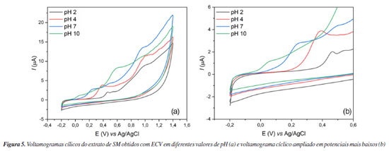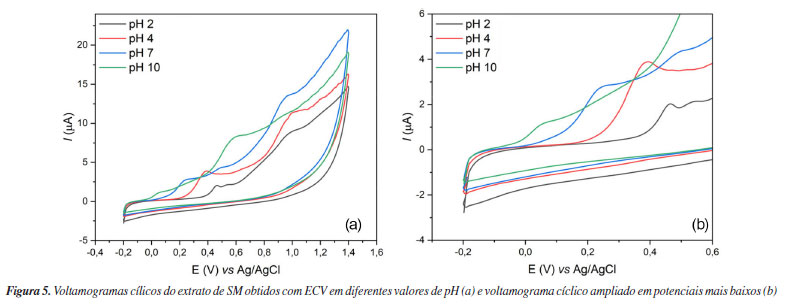 O poder redutor de íons férrico (Fe3+) (FRAP) foi avaliado partindo da curva analítica (y = 0,035x + 0,464, R2 = 0,9845) (Tabela 2) utilizando AA como padrão, obtendo-se 46,84 ± 5,54 mg AA g-1. A importância de se avaliar o efeito antioxidante de extratos na redução de íons férrico (Fe3+) a íons ferrosos (Fe2+) reside na presença da reação de Foto-Fenton que ocorre em organismos aeróbicos. O Fe atua como catalisador quando reage com o radical superóxido (O2-) produzindo íon hidroxila e radical hidroxila através das reações de Foto-Fenton e Haber-Weiis. O radical hidroxila, por sua vez, é altamente reativo com curto período de vida e não há enzima antioxidante para neutralizá-lo.47,53,54 Considerando que SM apresentou significativo poder antioxidante na redução de íons férrico, torna-se um candidato capaz de prevenir a geração do radical hidroxila, evitando danos oxidativos a biomoléculas e organelas. Além de técnicas espectrofotométricas comumente utilizadas para a determinação do potencial antioxidante de extratos vegetais, métodos eletroquímicos se configuram como técnicas alternativas para se quantificar essa propriedade.55 Os métodos eletroquímicos permitem a obtenção de dados valiosos sobre reações de transferência de elétrons, sem a necessidade de etapas prévias de tratamento do analito, garantindo respostas rápidas com alta sensibilidade.56 A análise da atividade antioxidante é realizada por meio da avaliação do potencial de oxidação (Epa), sendo que valores mais baixos indicam maior facilidade na doação de elétrons e, consequentemente, maior atividade antioxidante.57 Na análise feita com SM, os resultados obtidos a partir dos voltamogramas cíclicos (Figura 5) indicaram redução acentuada do Epa à medida que o pH aumentava (Tabela 3), sugerindo que o ambiente alcalino facilita a doação de elétrons pelos compostos antioxidantes presentes em SM. Observou-se também a formação de duas correntes de pico anódicas (Ipa), sendo o primeiro pico um indicativo da presença de rutina no extrato, que apresenta potenciais próximos a 0,23 V em pH 7.58 Já o segundo pico visualizado é um indicativo de compostos nitrogenados, podendo apresentar potenciais próximos a 1,0 V,59 sendo, possivelmente, referentes aos alcaloides que possam estar presentes no extrato. Alguns alcaloides descritos na literatura,60-62 como as β-carbolinas harmano, harmina, harmalina e harmalol e também a quinina, apresentam potenciais próximos aos valores obtidos nos voltamogramas, variando de 0,4 até 1,5 V, a depender do pH.