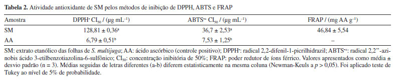 Considerando o potencial tripanocida de outras espécies da família Fabaceae, verificou-se que a biochanina A, uma isoflavona isolada dos frutos de Cassia fistula, exibiu promissora atividade contra T. cruzi (concentração efetiva (CE50) = 18.32 μg mL-1), sendo 24 vezes mais ativa que benzonidazol.40 Essa constatação abre perspectivas para a continuidade da avaliação do potencial tripanocida de extratos obtidos de outras partes de S. multijuga, bem como de outras espécies da família Fabaceae. Em se tratando do efeito tripanocida dos compostos isolados, a astragalina apresentou baixo CI50 (15,7 ± 11,1 μg mL-1) quando comparado ao benzonidazol (15,8 ± 0,9 μg mL-1).41 O kaempferol, por sua vez, exibiu efeito fraco (CI50 23,9 ± 1,6 μg mL-1) frente ao parasita, enquanto seus análogos glicosilados (kaempferol-3-O-glicosídeo e kaempferol-3-O-rutinosídeo) e a quercetina foram inativos.42 Tais evidências indicam que a busca por moléculas ativas contra T. cruzi permanece desafiadora. Essa constatação abre perspectivas para a continuidade da avaliação do potencial tripanocida de extratos obtidos de outras partes de S. multijuga, no entanto, com o uso de solventes de outra natureza, visando obter classes químicas que se apresentassem mais promissoras, como foi observado para o extrato clorofórmico das folhas de S. villosa.13,14 Alguns dos metabólitos anotados no presente estudo já tiveram seu potencial citotóxico avaliado. Demonstrou-se o efeito citotóxico da quercetina sobre fibroblastos 3T3, que foi constatado quando utilizadas concentrações superiores a 50 mM, ao passo que a rutina isolada não exibiu citotoxicidade (CI > 200 mM).43 A atividade citotóxica do eriodictiol já foi também reportada44 para diferentes linhagens tumorais, com destaque para o carcinoma hepatocelular (HepG2), onde esse metabólito foi capaz de suprimir a motilidade e crescimento celular pela desativação da inflamassoma NLRP3. O kaempferol exibiu atividade anti-proliferativa de células tumorais de bexiga por apoptose, suprimindo a função de algumas enzimas.45 Dessa forma, a avaliação do potencial citotóxico de extratos contendo esses metabólitos permanece relevante. Atividade antioxidante A concentração de compostos fenólicos totais (CFT) foi determinada utilizando-se ácido gálico como padrão para construção da curva analítica. O resultado foi expresso como mg AG g-1. O teor de flavonoides totais (FT) foi determinado utilizando-se quercetina como padrão para construção da curva analítica. O resultado foi expresso como mg QER g-1. Para SM, observou-se que CFT (Abs = 0,0223[amostra] + 0,0916, R2 = 0,9945) foi de 177,25 ± 1,3 mg AG g-1, bastante superior ao reportado para para o extrato metanólico das folhas de S. alexandrina (22,25 ± 0,29 mg QER g-1) e S. italica (21.54 ± 0.28 mg QER g-1).30 O teor de FT (Abs = 0,0287[amostra] +0,063, R2 = 0,9981) de SM foi de 40,81 ± 0,88 mg QER g-1, valor quase 25% menor que o descrito para o extrato metanólico das folhas de S. auriculata (156,64 ± 0,97 mg QER g-1).46 Essas observações indicam a influência do solvente sobre a extração. A espécie estudada no presente trabalho é rica em CFT e FT. Compostos fenólicos e flavonóides são de ampla ocorrência nos mais diversos tipos de extratos de Senna spp., entre os quais destacam-se catequinas, proantocianidinas, rutina, quercimeritrina, glicosídeos de kaempferol e crisofanol.4 A presença de compostos fenólicos em geral e de flavonoides no extrato SM justifica a atividade antioxidante, pois tais metabólitos são capazes de neutralizar espécies reativas de oxigênio (EROs), tais como oxigênio singleto, radical hidroxila, superóxido, radicais peroxila, alcoxila e outras espécies reativas radicalares ou não, de outros elementos.47,48 Essa ação antioxidante é classificada em dois distintos mecanismos: transferência de átomos de hidrogênio (TAH) e transferência de elétron singleto, ou simplesmente, transferência de elétron (TE). Ensaios baseados em TAH consistem na habilidade do antioxidante em doar e transferir átomos de hidrogênio para estabilizar radicais livres ou espécies reativas não radicalares. Os ensaios baseados em TE, por sua vez, consistem na transferência de um ou mais elétrons para reduzir e estabilizar o alvo oxidante. Ensaios como capacidade de absorção de radicais de oxigênio (ORAC) e parâmetros de captura de radicais totais são exemplos de ensaios que avaliam a atividade antioxidante por mecanismo de TAH, enquanto ensaios de captura de radicais como DPPH, ABTS+ e poder redutor de íons férrico (FRAP) são exemplos de ensaios que avaliam por meio de mecanismo de TE.27,49,50 Os resultados obtidos de atividade antioxidante estão apresentados na Tabela 2. SM exibiu CI50 de 128,81 ± 0,36 μg mL-1 frente ao radical DPPH, sendo considerado um potencial antioxidante moderado se comparado com o controle positivo ácido ascórbico (AA), cujo CI50 foi de 6,79 ± 0,51 μg mL-1. Outro fator que pode ter contribuído para essa inibição moderada está no fato de que os flavonoides glicosilados apresentam menor potencial antioxidante em relação à sua respectiva aglicona. A coplanaridade de um flavonoide, como no caso da quercetina, favorece a propriedade antioxidante do extrato, mas, por outro lado, as suas respectivas formas glicosiladas têm a coplanaridade comprometida. Flavonóis não glicosilados que são coplanares apresentam deslocalização de carga pelo alinhamento dos orbitais, o que favorece a doação e transferência de átomos de hidrogênio e elétrons da hidroxila fenólica.51 Portanto, a presença de flavonóis glicosilados pode ser um fator que justifica a atividade antioxidante moderada.