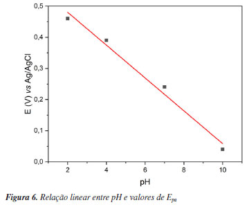 Esse comportamento é habitual para antioxidantes fenólicos, pois o aumento do pH pode desprotonar os grupos -OH, resultando na formação de fenolatos. Estes fenolatos são melhores nucleófilos em comparação aos fenóis, doando com facilidade seus elétrons.63 Além disso, foi identificada uma relação linear entre o pH e o Epa do primeiro pico (Figura 6), evidenciando que, em todos os casos, o processo de transferência de elétrons está acoplado à transferência de prótons (proton-coupled electron transfer, PCET), um mecanismo frequentemente observado na oxidação de compostos fenólicos. Esse resultado sugere que a reação envolve a transferência equimolar de prótons e elétrons.64