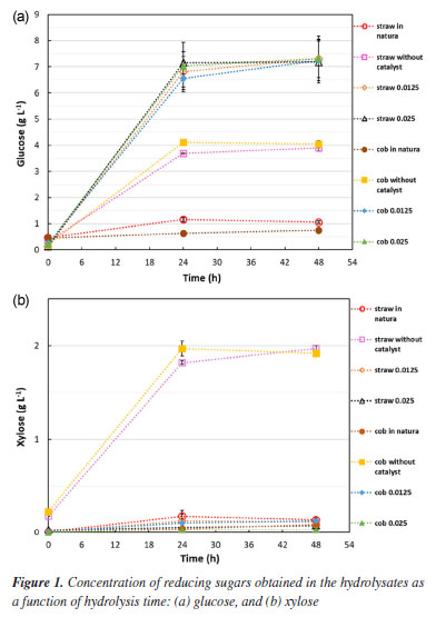 The composition can change depending on the region and time of collection. The corn straw and cob used in this study were comparable in composition to those found in the literature.43,44 Organosolv pretreatment of the biomasses individually The corn straw and corn cob biomasses, pretreated separately with the commercial glycerol, were subjected to enzymatic hydrolysis to identify how the different pretreatment conditions influenced enzymatic digestibility. Figures 1a and 1b show, respectively, the concentration of glucose and xylose obtained in the hydrolysates.