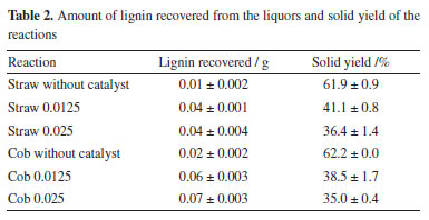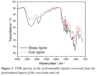 Figure 2 shows the FTIR spectra of the lignins from corn straw and cob. The profile of these is similar to those of lignin spectra obtained in literature studies.28,30,47,48 They presented a broad band in the 3600-3200 cm-1 region attributed to hydroxyl groups present in alcohols and phenolic compounds, and peaks related to the vibration of the aromatic structure in the 1600-1450 cm-1 region.