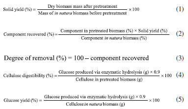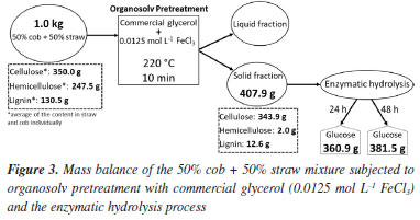 CONCLUSIONS The organosolv pretreatment with glycerol of the corn straw and corn cob biomasses individually revealed that they behave similarly, giving rise to pretreated biomasses with equivalent characteristics. The pretreatment condition using 0.0125 mol L-1 of FeCl3 was considered the best, since it produces an amount of glucose equivalent to that of the condition using 0.025 mol L-1, and the reactions without catalyst were less efficient for glucose production. Pretreatment with the 50% cob + 50% straw mixture showed that it is feasible to use this waste simultaneously, which can facilitate processing. The application of crude glycerol proved promising, given that glucose remains the majority sugar. It became evident that the pretreated biomass can be subjected directly to enzymatic hydrolysis without going through the washing and drying stages.