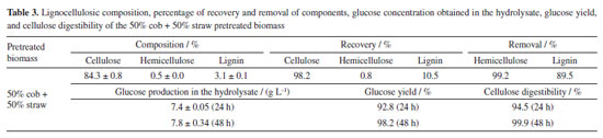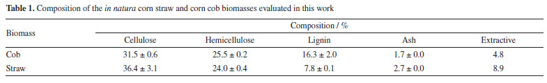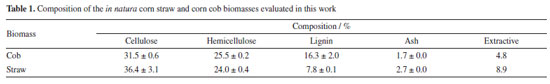 RESULTS AND DISCUSSION Composition of the in natura biomasses The composition of the in natura biomasses (Table 1) indicates that they are suitable for second-generation ethanol production since they have a high content of structural carbohydrates (cellulose and hemicellulose). It can be seen that the composition of corn straw and cob is similar, with the greatest differences being in the lignin and extractive content. The cob has about twice as much lignin as the straw, which explains its greater hardness.