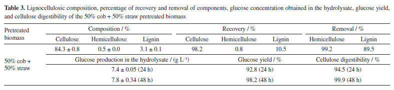 It is important to note that in this study, as in a previous study13 it was not necessary to add acid to the liquor to precipitate the lignin, a common practice in the literature23,30,49 since it was already dispersed in the acidic pH liquor (pH 5-6). Thus, only the separation was carried out using the centrifugation technique. The lignin was also washed in the centrifuge, and the water consumption was managed and corresponded to the minimum necessary to remove excess glycerol and enable drying. Thus, the recovery of lignin in this research took place through a simple and sustainable process. The hydrolysis and lignin recovery results corroborate with the solid yield of the reactions (Table 2), which were very similar for the two biomasses. Thus, despite the relevant difference in the composition of straw and cob concerning lignin, organosolv pretreatment with glycerol resulted in very similar materials, as evidenced by the equivalent release of glucose and xylose in the two pretreated biomasses. Organosolv pretreatment with mixture of the biomasses Given the very similar behavior of corn straw and cob in pretreatment reactions, additional experiments were conducted using a mixture of these biomasses (50% cob + 50% straw), an approach not previously reported in the literature. The best pretreatment condition was adopted, i.e., using 0.0125 mol L-1 of FeCl3. The lignocellulosic composition of the biomass pretreated in this situation, as well as the percentage of components recovery and removal, the concentration of glucose obtained in the hydrolysate, the glucose yield, and the cellulose digestibility are shown in Table 3.