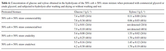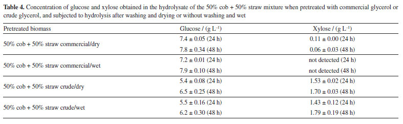 The analysis of Table 3 reveals that this pretreated biomass showed excellent recovery of cellulose, as well as high removal of hemicellulose and lignin. These are aspects sought in the pretreatment of biomass for the production of cellulosic ethanol, since they indicate fractionation, reduction of recalcitrance by removing lignin and hemicellulose for the liquid fraction (liquor), and preservation of cellulose in the solid fraction. Cellulose is the component of greatest interest in the production of bioethanol, as it is the main source of glucose that will later be fermented. This result was reflected in the amount of glucose produced in the hydrolysate and the excellent cellulose enzymatic digestibility, which reached 94.5% in 24 h and 99.9% in 48 h, i.e., practically all the cellulose was converted into glucose during enzymatic hydrolysis. It is therefore clear that mixing these two lignocellulosic residues, coming from the same agroindustry, is a good strategy. The amount of glucose produced in the hydrolysate of the mixture was very similar to that obtained with the cob and straw individually (Figure 1). The molecular mechanism that occurs in the hydrolysis of lignocellulose was investigated by Zhang et al.50 This contributes to the understanding of the effect of the optimal condition of pretreatment with glycerol/FeCl3 on increasing the saccharification of the biomasses evaluated here. Based on the work cited, the high production of glucose in the hydrolysis process, in addition to being a result of the large removal of hemicellulose and lignin in the pretreatment, is attributed to the preservation of cellulose with many amorphous regions that act as interruption points to initiate and complete the enzymatic hydrolysis of cellulose nanofibers. Organosolv pretreatment with a mixture of the biomasses: commercial glycerol versus crude glycerol and dry biomass versus wet biomass Pretreatment reactions with a mixture of 50% cob and 50% straw were also carried out with the crude glycerol from biodiesel production. Additional reactions using this biomass mixture were conducted with both commercial glycerol and crude glycerol, and the pretreated biomass without washing and wet was subjected directly to the enzymatic hydrolysis stage, to verify the possibility of eliminating the washing and drying stages of the pretreated biomass (Table 4).