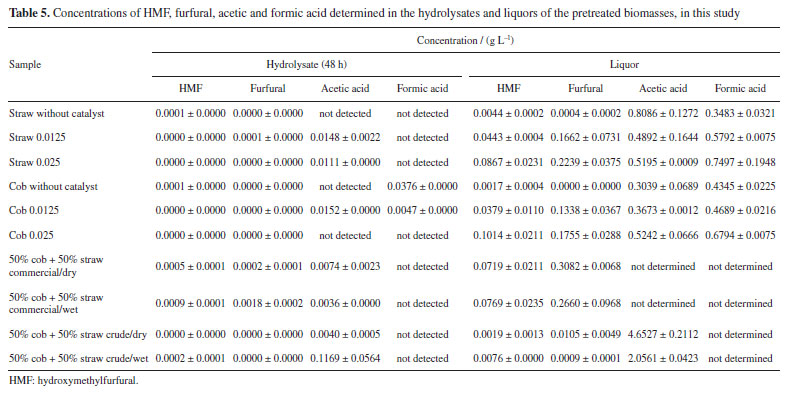 The results of Table 4 are promising. It can be seen that crude glycerol has the potential to be used in corn cob and straw pretreatment reactions. Although the production of glucose in the hydrolysate have been smaller than that obtained with commercial glycerol, was offset by the production of xylose, which indicates a lower removal of hemicellulose with the use of crude glycerol. The lower selectivity for glucose production should not have much impact on the fermentation process, given that glucose remains the majority sugar. In addition, xylose can contribute to the ethanol yield, provided that a more careful choice of fermenting microorganism is made, as research indicates that some are capable of fermenting glucose and xylose simultaneously.51 The analysis in Table 4 also shows that carrying out hydrolysis immediately after the pretreatment reaction with the wet pretreated biomass, without being subjected to the washing and drying steps, does not cause any harm to sugar production, whether using commercial or raw glycerol. This result is a differentiator and is of great importance, significantly improving the sustainability of the process, since it leads to significant savings in water and energy resources. In previous work13 an investigation was carried out regarding the use of crude glycerol in the pretreatment of water hyacinth biomass. Among the various tests carried out, the situation using crude glycerol subjected to simple treatment and keeping the reactor open resulted in the release of total reducing sugars equivalent to that using commercial glycerol, but the released sugars were not discriminated. An evaluation of Table 4 shows that, in this study, the release of total reducing sugars (glucose + xylose) using crude glycerol was also equivalent to that obtained using commercial glycerol. The same previous work13 tested the direct submission of wet and without washing pretreated biomass to the enzymatic hydrolysis process, and the results corresponded to those of this study, there was no loss in the production of reducing sugars. Ji et al.20 studied the pretreatment of Moso bamboo biomass with various sources of glycerol and, also, evaluated the non-washing of the pretreated biomass. They used a pressure filtration process, without the use of water, which keeps glycerol residues under the pretreated solid. Enzymatic hydrolysis was carried out, and with one of the glycerol sources, resulting from the production of biodiesel with KOH, the glucose yield was not impaired. The works of Zhang et al.52 and Zhu et al.28 investigated the effect of the presence of certain concentrations of glycerol in the enzymatic hydrolysis reaction medium. In both cases, glycerol had no negative impact at concentrations of up to 2% by weight. Thus, in this study, filtration in fabric, in which the biomass was squeezed through the fabric to remove excess liquid, meant that few glycerol residues remained adhered to it, since there was no unfavorable effect on the release of sugars in the enzymatic hydrolysis carried out with the unwashed biomass. Being that, the addition of a little water to the pretreatment reactor before filtration, to enable the content to be transferred, helped to reduce the adherence of the glycerol to the pretreated biomass. Determination of HMF, furfural, acetic acid, and formic acid Table 5 shows the concentrations of HMF, furfural, acetic and formic acid that were determined in the hydrolysates and liqueurs. These compounds, at certain concentration levels, can inhibit the action of the microorganisms responsible for fermentation. Thus, the quantification of these by-products makes it possible to assess the capacity for producing ethanol from the hydrolysate and the pretreatment liquor.