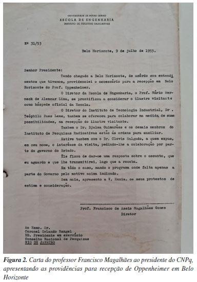 O CONVITE PARA O CIENTISTA Com a disposição militar pela possível produção de uma bomba nuclear pelo Brasil e a busca de cientistas por aplicações mais nobres do uso da energia nuclear, Oppenheimer foi convidado pelo CNPq para vir ao Brasil pela primeira vez em 1935.16 O convite à Oppenheimer decorre do forte impacto que o Projeto Manhattan gerou no panorama nuclear global. A visita do cientista a Belo Horizonte aconteceu por forte influência e apoio do professor Francisco de Assis Magalhães Gomes (1906-1990) que foi um dos fundadores do IPR, e Diretor da Escola de Engenharia da UFMG. Tinha como o objetivo principal expandir as aplicações pacíficas da energia nuclear no Brasil. A participação dele no Conselho Deliberativo do CNPq permitiu a liberação de recursos que levaram a instalação do IPR na UFMG. No documento No. 31 de 9 de julho de 1953 (Figura 2), o professor Francisco Magalhães escreve ao Presidente em exercício do CNPq, Coronel Orlando Rangel, e confirma que após ter retornado da capital federal na época, a cidade do Rio de Janeiro, tudo estava preparado para a visita de Oppenheimer a Belo Horizonte. O diretor da Escola de Engenharia entre 1944 e 1964, Mário Werneck de Alencar Lima (1904-1976), propôs colocar o cientista como hóspede oficial. Para acompanhar e auxiliar Oppenheimer, se colocaram à disposição vários membros do IPR, entre um dos seus fundadores o Professor Djalma Guimarães (1894-1973), que como o Professor Francisco Guimarães também fez parte da fundação do CNPq. O vice-governador e depois Governador e Ministro da Educação e Cultura, Clóvis Salgado da Gama (1906-1978), ficou encarregado de analisar a parte da visita que envolveria oficialmente o governo estadual. O Instituto de Tecnologia Industrial (ITI), instalado inicialmente em dependência da Escola de Engenharia da UFMG e, após, no Instituto de Química da Escola de Engenharia da UFMG, na Rua da Bahia 52, também deu apoio a visita.