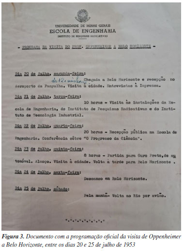 EM BELO HORIZONTE Pela programação planejada pelos membros do IPR (Figura 3) o cientista norte-americano deveria chegar no Aeroporto da Pampulha, onde já seria recepcionado por uma comissão, numa segunda-feira, dia 20 de julho de 1953, e a visita terminaria com a volta para o Rio de Janeiro no sábado, dia 25 de julho. Após o acolhimento em sua chegada, haveria um deslocamento para a parte urbana da cidade onde Oppenheimer concederia uma entrevista aos veículos de imprensa. As atividades retornariam somente no dia seguinte, 21 de julho, às 10 horas, quando o pesquisador conheceria de forma detalhada as instalações da Escola de Engenharia, do IPR e do ITI.