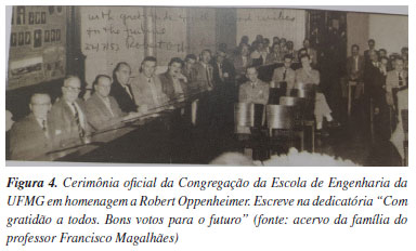 Finalizou elogiando os trabalhos dos técnicos brasileiros.22 O cientista passava por uma fase turbulenta, com várias perseguições políticas em seu país. Durante o tempo que permaneceu no Brasil foi monitorado por aparatos de inteligência do Governo dos Estados Unidos da América. É possível que até mesmo os professores mais próximos a ele, como alguns da Universidade de Minas Gerais (UMG), posteriormente Universidade Federal de Minas Gerais (UFMG), e outros contatos, também tenham sido alvo de monitoramento.7 Oppenheimer na Escola de Engenharia/UFMG Seguindo o planejamento, na quarta-feira, 22 de julho, ocorreria uma recepção pública na Escola de Engenharia, e às 20 horas a tão esperada conferência (Figuras 4 e 5), que inicialmente seria sobre "O progresso da ciência" (The progress of science), mais especificamente sobre os avanços da aplicação da radioatividade para fins pacíficos.