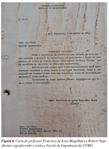 Em uma carta do professor Francisco Magalhães a Oppenheimer, na qual demonstrou sua satisfação e agradecimento com a apresentação, é revelado que a Conferência apresentada na Escola de Engenharia foi gravada em seis discos e foi enviada em 03 de agosto de 1953 ao cientista (Figura 6).
