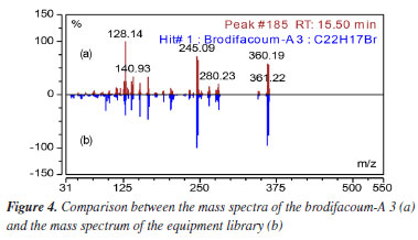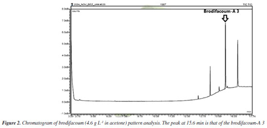 EXPERIMENTAL Reagents Acetone P.A. and methanol P.A. were obtained from Modern Chemistry (São Paulo, Brazil) and formic acid P.A. was obtained from Êxodo Scientific (São Paulo, Brazil). Brodifacoum standard 95% was obtained from Krodec (São Paulo, Brazil), batch 20240220, manufactured in 02/2024. The commercial rodenticide, in the form of pellets, was obtained from the regular pesticide trade in 25 g bags with a brodifacoum concentration of 0.005%. Preparation of standards The standards were made from brodifacoum stock solution prepared with 0.0242 g of the standard 95% in 5 mL of P.A. acetone, resulting in a concentration of 4.60 g L-1. Aliquots of the stock solution were removed to obtain solutions with brodifacoum concentrations ranging from 0.4 to 2 g L-1. Instrumental conditions of analysis The degradation products of brodifacoum were identified through a chromatogram obtained using a Thermo Scientific Trace 1310 gas chromatograph coupled to an ISQ 7000 single quadrupole mass spectrometer (Thermo Fisher Scientific Inc., Waltham, USA). Chromatographic separation was performed using a Thermo Scientific NA-5MS capillary column (30 m × 0.25 mm internal diameter (i.d.), 0.25 µm film thickness) with helium (99.999%) as the carrier gas at a flow rate of 1.0 mL min-1. The sample solution (1.0 µL) was injected in splitless mode at 250 ºC using a Thermo Scientific TriPlus RSH autosampler. The analysis was performed with the following temperature gradient: isotherm at 50 ºC for 1 min; increase to 325 ºC at a rate of 20 ºC min-1; isotherm at 325 ºC for 3 min. The GC-MS interface temperature was 300 ºC, and the solvent delay was set to 4 min. Electron ionization mass spectrometry was performed at 70 eV, and the mass spectra were acquired in full-scan mode. The full-scan acquisition range was m/z 40-550. Method validation The method was validated for the following parameters: linearity, limit of quantitation (LOQ), limit of detection (LOD), precision and selectivity.27 Linearity Linearity test solutions for the assay method were prepared from a stock solution at five levels of analyte concentration (0.4, 0.5, 1.0, 1.5 and 2.0 g L-1). The peak area vs. concentration data was analyzed with least squares linear regression. The slope and y-intercept of the calibration curve was reported. Limit of quantification and limit of detection The limit of quantification (LOQ) and limit of detection (LOD) were based on the standard deviation of the blank response and the slope of the constructed calibration curve.27 Precision The precision of the assay method was evaluated by carrying out three independent assays of a reference standard of brodifacoum at a concentration of 1.0 g L-1. The percentage of the relative standard deviation (%RSD) of three obtained assay values was calculated.27 Selectivity The proposed selectivity method was evaluated to verify whether any excipients commonly found in rodenticide products interfere with the analysis when eluted during the retention time of the substance of interest, which must be well separated from the other compounds present in the sample.28 Extraction procedure in rodenticides and poisoned foods In the analysis of rodenticides in pellet form, these were previously macerated and mixed with the extraction solvent, which in this case was acetone P.A. or a 50:1 solution of methanol and formic acid. In the case of foods permeated with the rodenticide, aliquots of the material were separated and the extraction process carried out. Aliquots of 10 g of the formulated product or 30 g of the contaminated food were used, and 50 mL of the extracting solvent was added. Analyses were performed in triplicates. The mixtures were sonified for 10 min, filtered, and the liquids were evaporated to 1 mL at room temperature (25 ºC).21