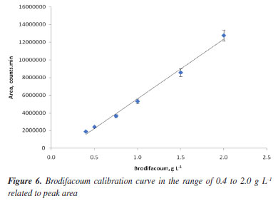 The use of selected ion monitoring (SIM) would provide a higher level of selectivity than full-scan; however, for the analysis of brodifacoum in food, full-scan mass spectrometry is more suitable than SIM because it allows simultaneous detection of multiple compounds. This is especially important in complex food matrices, where unexpected interferences may occur.30 It has been demonstrated that GC-MS in full-scan mode provided high precision and broad linearity for pesticide quantification in food samples.31 Linearity The calibration curve for brodifacoum-A 3 was linear over the concentration range of 0.4-2.0 g L-1. The data for brodifacoum-A 3 peak area versus brodifacoum standard concentration were treated by linear regression analysis and the correlation coefficient (r) of 0.992 was obtained as can be seen in Figure 6. The regression equation for the calibration curve was found to be y = 6738318.4x + 1138106.5. The results revealed an excellent correlation between the peak area and analyte concentration.28