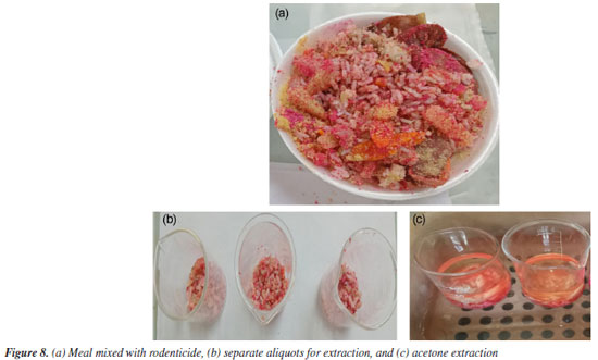 Analysis of food mixed with rodenticide In order to test the identification of brodifacoum in foods contaminated by commercial rodenticides, 25 g of commercial rodenticide were mixed on the surface of 450 g of a meal, as shown in Figure 8, simulating a real case of poisoning. It is common to grind rodenticides and mix them into food to disguise their presence and flavor. Three aliquots of 30 g of the sample were separated and 50 mL of acetone was added to extract the brodifacoum. Since the solubility of brodifacoum in acetone is 6-20 g L-1,33 the use of 50 mL of the extracting solvent is sufficient to extract all the active ingredient from the formulated product permeated in the food.