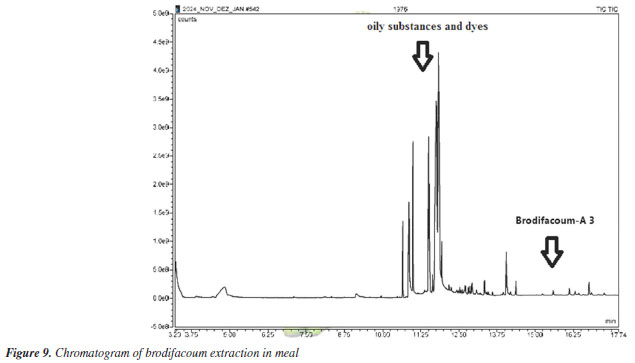The mixtures were sonicated for 10 min, concentrated to 1 mL at room temperature (25 ºC), filtered and analyzed directly without dilution. The analyses were performed and the presence of brodifacoum-A 3 was identified in all aliquots, demonstrating that its mixture in foods does not interfere with its detection, as can be seen in Figure 9.