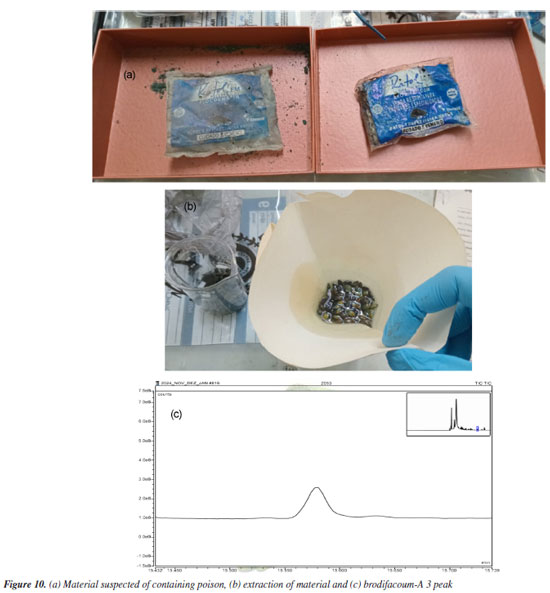 CONCLUSIONS In this work, brodifacoum determinations were studied by gas chromatography coupled to mass spectrometry. The chromatogram obtained identified brodifacoum-A3 as the main degradation product, and a calibration curve was created relating the degradation product to the concentration of the brodifacoum standard, which showed good linearity, allowing identification of the active ingredient with smaller amounts of sample. The qualitative identification tests for brodifacoum-A 3 in a simulated contaminated food sample were satisfactory, allowing us to conclude that the active ingredient was present even when mixed with organic matter. The method was applied to a real case of poisoning and it was possible to identify brodifacoum-A 3 in the sample, assisting in the preparation of the expert report. The method has limitations due to the degradation of brodifacoum at high temperatures and its quantification in complex matrices, with the liquid chromatography technique being the most suitable for thermolabile compounds. However, the results show that the method is effective for qualitative analysis of materials suspected of containing poison, which are commonly contaminated with large amounts of rodenticide, identifying the active ingredient and becoming an option in forensic laboratories. Forensic laboratories that do not have liquid chromatography can use the methodology described in this article to identify brodifacoum in samples suspected of having been contaminated with coumarins, helping criminal investigations with more trustworthy reports.