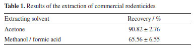 LOQ and LOD The LOQ and LOD were determined in triplicate, based on 10 and 3.3 times the standard deviation of the response, respectively, divided by the slope of the calibration curve. The LOD was found to be 0.09 g L-1 and the LOQ was found to be 0.27 g L-1.28 Precision The precision of the method was determined by the repeatability (intra-day precision) of the brodifacoum standard solutions. Repeatability was calculated by analyzing three samples of the 100% standard concentration (1.0 g L-1) on the same day. The %RSD of intraday assays values obtained was 5.14, which is an accepted value in trace or impurity analysis methods.28 Selectivity The selectivity test demonstrated that the excipients present in the rodenticide formulations did not interfere with the identification of brodifacoum, as can be seen in Figure 7. Rodenticide analysis Samples of commercial rodenticides in the form of pellets were extracted with acetone or a 50:1 methanol:formic acid mixture and analyzed by chromatography, comparing the results to verify the efficiency of the extraction process. Acetone was chosen because it is a solvent that solubilizes brodifacoum well and the 50:1 methanol:formic acid mixture was compared based on the findings of Yuen,21 who achieved good recovery of the analyte and had less carryover of oily substances and dyes that could interfere with the analysis. The recovery results were calculated from the concentration reported on the rodenticide packaging (0.005%, m/m) and can be seen in Table 1.