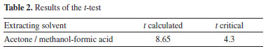 The results show that the extraction of brodifacoum-A 3 from rodenticide samples using acetone was more efficient than with a mixture of methanol and formic acid. The confidence interval shown in the table was calculated with a 95% confidence level. A paired t-test was then performed between the results, and a statistical difference was found in the means, suggesting a difference between the mean values,32 as can be seen in Table 2.