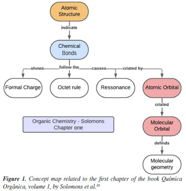 For a thorough analysis of the contents of the textbooks presented, a map was created containing the main topics of the initial chapters of each work; this allowed us to perform a comparative analysis of their structures and approaches. The Solomons edition is divided into two volumes; the first of which is a more introductory general content while the second volume covers more specific contents, where many of the reaction mechanisms are discussed in greater depth. The first volume, which was the focus of this study, begins with a chapter on chemical bonding and atomic/molecular structure entitled "The basics". Acidity and basicity and stereochemistry are found in chapters 3 and 5 of the book, respectively. A unique feature of this book is that at the end of the chapters, there are mind maps that help the student understand the subject studied. In the map of the first chapter of the book Química Orgânica by Solomons et al.,30 presented in Figure 1, one will observe that the book begins with atomic structure as part of its presentation of more abstract concepts, such as atomic and molecular orbitals, and even chemical bonding, which in turn appears as an introductory concept for the other concepts presented in the book, as Mullins41 suggested. The volume of the book by Paula Bruice is divided into 3 main parts; the first chapter of the book - "Electronic structure and bonding - Acids and Bases", talks about chemical bonds, hybridization, Lewis structure, and acidity and basicity within organic matter; stereochemistry is found in the fifth chapter of the book, in the second part of the division.