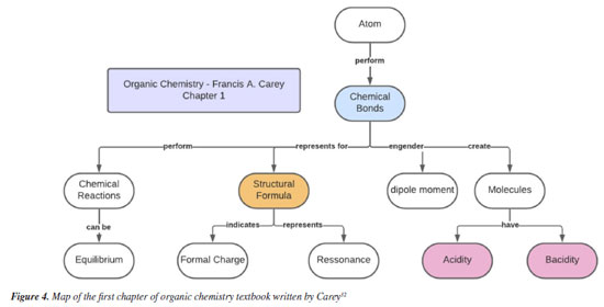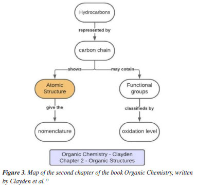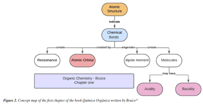 Figure 2 shows the concepts related to the first chapter of the book by Paula Bruice, where structure (atomic and molecular) and chemical bonding appear in the same sequence, followed by explanations on acids and bases and electron distribution.