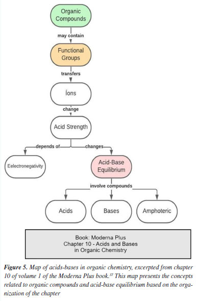 Figure 5 presents a map on organic compounds, taken from the book approved under the PNLD 2021, Moderna Plus, which contains a specific chapter on acids and bases in organic chemistry. Figure 6 presents the acid-base concept exclusively from an inorganic perspective, thereby highlighting how the same concept can be approached from different perspectives.