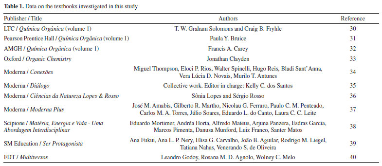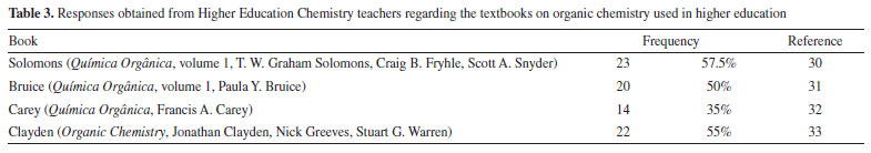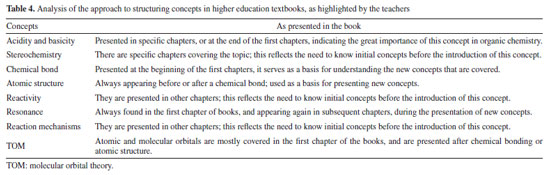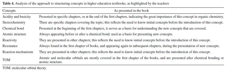 In the book written by Carey,32 the presentation begins with atoms as the initial concept, followed by bonds, molecules and the concept of acidity-basicity. Even though the chapter is entitled "Atomic structure", this concept is presented together with bonds; in essence, this shows that the two concepts are dependent. These small conceptual and organizational differences occur because each book presents a specific organization and each presentation is made in a different order. However, there is a certain similarity in relation to the chemical concepts that are considered basic by the teachers - these include chemical bonding, acidity-basicity, atomic/molecular structure and stereochemistry. To facilitate understanding, Table 4 highlights the concepts that were indicated by the teachers.