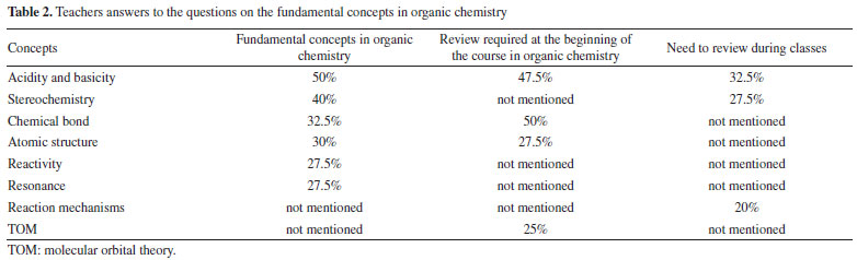 RESULTS AND DISCUSSION Perceptions about structuring concepts in the teaching of organic chemistry The teachers were asked questions on the selection of scientific concepts in organic chemistry in different scenarios: the fundamental concepts in organic chemistry; the concepts that are reviewed at the beginning of a course; the concepts reviewed during the course and the most essential concepts of the area. As can be seen in Table 2, acidity-basicity was the concept that was most cited by the teachers (20 or 50%), followed by stereochemistry (16 or 40%) and chemical bonding (13 or 32.5%). As can be noted, two of the concepts classified as the most important in organic chemistry came from the basic cycle of a Higher Education Chemistry course.