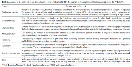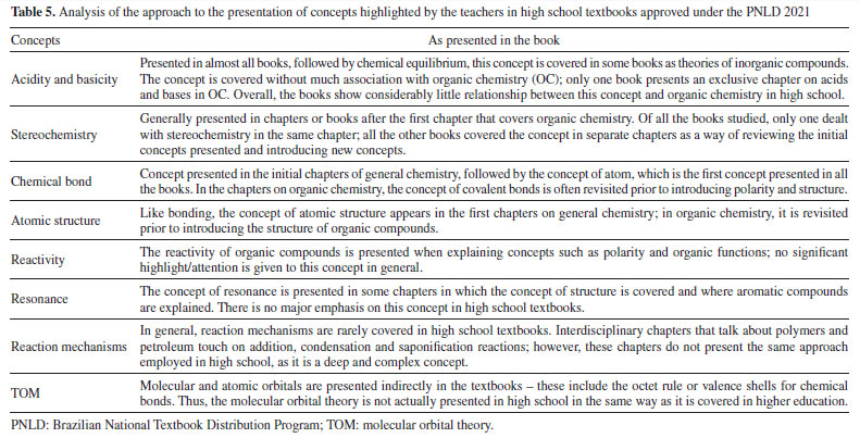 Associating the concepts highlighted by the teachers with those addressed in the initial chapters of Higher Education Organic Chemistry textbooks, two main aspects are noted: (i) general chemistry concepts, such as chemical bonds and atomic structures, are equally essential for understanding organic chemistry - this is clearly in line with the theories of conceptual hierarchy;7 and (ii) the concepts of acids and bases should be considered structuring concepts of organic chemistry, since they were widely mentioned by the teachers, and they appear in the initial chapters of two of the four books analyzed (Bruice and Carey),31,32 in addition to being covered in separate chapters throughout the book by Solomons et al.30 Analysis of the textbooks used in basic education A careful analysis of the different conceptual maps shows how the main concepts highlighted by teachers are treated in the textbooks used in high school. Table 5 shows the concepts considered fundamental in organic chemistry, identified both by teachers and in higher education textbooks, appear in the works approved under the PNLD 2021. Another relevant finding is the contrast between the macroscopic emphasis in high school textbooks and the submicroscopic and representational focus in higher education materials. This misalignment can hinder conceptual progression of the students, especially when they transition to more abstract content in university-level organic chemistry, such as orbital theory or stereochemical analysis.