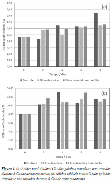 As imagens de MEV do artigo original de pesquisa (Quadro 2) subsidiaram a elaboração do Quadro 4 do ECI, sendo os dados nelas dispostos apresentados de forma descritiva aos estudantes, uma vez que lidar criticamente com representações visuais bidimensionais, como as obtidas do MEV, não é uma habilidade trivial.21 A narrativa da parte I do ECI é finalizada com a seguinte observação: diante dos resultados obtidos, Cláudio acredita que pode auxiliar a empresa, no que diz respeito à solicitação colocada, sobre a possibilidade de ampliar o raio de distribuição das goiabas para venda. Em seguida, são apresentadas três questões. Parte II do ECI: A cobertura das goiabas A parte II do ECI, denominada "A cobertura das goiabas", é iniciada com a narrativa sobre a apresentação dos dados obtidos por Cláudio (Quadros 3 e 4), à direção da empresa. Na ocasião, ele afirma que, para saberem se as soluções filmogênicas investigadas são apropriadas para a proteção das frutas, é necessário testá-las para recobrimento das goiabas. Posteriormente, é descrito o procedimento adotado por Cláudio para o recobrimento das goiabas e a forma como ele avaliou a perda de massa das frutas, por meio da diferença da massa inicial e a massa final obtida. Dessa forma, Cláudio foi capaz de construir um gráfico de linhas, no qual o eixo y ilustra a porcentagem da perda de massa e o eixo x mostra o intervalo de tempo de oito dias do experimento, para as goiabas revestidas com filmes de amido e nas frutas do controle (sem revestimento). Este gráfico encerra a narrativa, que é seguida de duas questões. Este é o único gráfico extraído diretamente do artigo original de pesquisa e adicionado, praticamente na íntegra, ao ECI. Parte III do ECI: O impasse das goiabas A parte III do ECI, denominada "O impasse das goiabas", é iniciada com a narrativa sobre as boas perspectivas de Claúdio frente aos resultados obtidos até então: os filmes pareciam promissores para utilização, pois diminuíam a perda de massa das goiabas ao longo do tempo considerado no experimento. No entanto, ainda restavam dúvidas: como decidir qual das soluções filmogênicas é a mais adequada para o recobrimento das goiabas? Teria a zeólita potencializado a ação dos revestimentos? Assim, ele foi impulsionado a realizar mais duas análises nas amostras de goiabas revestidas e nas frutas do controle: teor de acidez total titulável (ATT) e teor de sólidos solúveis totais (SST). A partir disso, Cláudio construiu os gráficos ilustrados na Figura 1. A apresentação dos gráficos encerra a narrativa e, na sequência, constam duas questões.