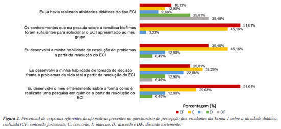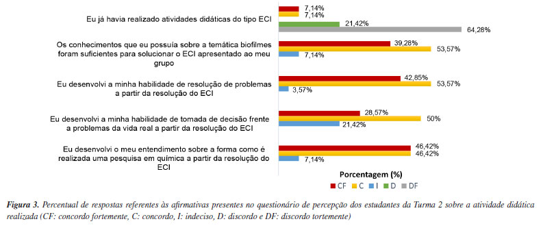 No início da quarta aula foi aplicado um questionário, tendo em vista a obtenção das percepções dos estudantes sobre a atividade didática realizada. Os alunos responderam às questões anonimamente com o intuito de preservar a sua identidade. Fornecidas as respostas aos questionários, foram iniciadas as apresentações orais sobre as resoluções dos ECI. No questionário, com cinco afirmativas, foi utilizado uma escala de classificação de 5 pontos, a escala Likert, composta pelas opções: concordo fortemente (CF), concordo (C), indeciso (I), discordo (D) e discordo fortemente (DF). A primeira afirmativa (Eu já havia realizado atividades didáticas do tipo ECI), estava associada a duas questões (Em caso afirmativo, indique quando e em qual contexto; Descreva como ocorreu o processo de resolução do ECI no seu grupo na disciplina (etapas, conflito, empatia, tipos de diálogo etc.). No que se refere à segunda afirmativa (Os conhecimentos que eu possuía sobre a temática biofilmes foram suficientes para solucionar o ECI apresentado ao meu grupo), as questões que a acompanhavam eram: Destaque conhecimentos sobre a temática que você possuía e que foram fundamentais para a resolução do ECI; Destaque novos conhecimentos sobre a temática que você adquiriu durante a resolução do ECI. Na terceira afirmativa (Eu desenvolvi a minha habilidade de resolução de problemas a partir da resolução do ECI), a questão associada foi: Apresente ações realizadas por você durante a resolução do ECI que colaboraram para o desenvolvimento dessa habilidade. Quanto à quarta afirmativa (Eu desenvolvi a minha habilidade tomada de decisão frente a problemas da vida real a partir da resolução do ECI), a questão apresentada na sequência foi: Apresente ações realizadas por você durante a resolução do ECI que colaboraram para o desenvolvimento dessa habilidade. Por fim, a quinta afirmativa (Eu desenvolvi o meu entendimento sobre a forma como é realizada uma pesquisa em química a partir da resolução do ECI), foi associada à questão: Apresente ações realizadas por você durante a resolução do ECI que colaboraram para o desenvolvimento desse entendimento.