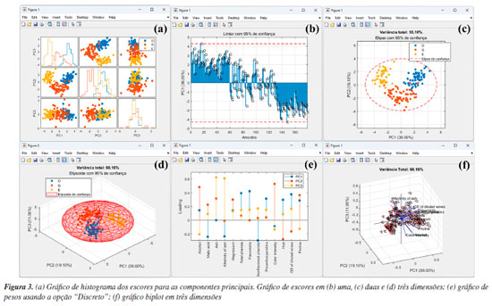 Na etapa seguinte, os usuários devem definir o tipo de pré-tratamento que será aplicado nas variáveis - colunas da matriz X usando o botão "Pré-processamento". Esse procedimento é essencial em qualquer análise quimiométrica, pois facilita a detecção e identificação de padrões e características relevantes nos conjuntos de dados químicos.1 Entre as opções de pré-tratamentos, o autoescalamento e a centragem na média estão entre os mais usuais. Neste exemplo, o autoescalamento é o procedimento mais recomendável, pois as variáveis têm diferentes unidades ou amplas faixas de variações. Nesses casos, ao aplicar esse procedimento, iguala-se o impacto entre as variáveis, ou seja, dá-se a mesma importância para todas as variáveis do conjunto de dados. Para a seleção do tipo de pré-tratamento no GAMMA-GUI, os usuários devem selecionar no botão "Pré-processamento", e escolher a opção "Autoescalamento". Agora, se o objetivo do usuário for avaliar dados espectrais, é preferível a aplicação da opção "Centragem na média", pois, ao centralizar os dados na média, a estrutura dos dados é preservada e a direção de maior dispersão ao redor dessa média coincide com a direção de maior variância interna dos dados, ou seja, as coordenadas são movidas para o centro dos dados, permitindo que as diferenças entre as variáveis se tornem mais perceptíveis.3,23,30 Existem ainda outras estratégias de pré-tratamentos, tais como o escalamento pela variância, pela amplitude, e variações de autoescalamento, como o autoescalamento de Pareto, VAST (variable stability) e nivelamento, entre outros.3 Além das etapas de pré-tratamento aplicadas às colunas da matriz X, existe ainda a possiblidade de pré-tratamento aplicado às linhas da matriz X, ou seja, às amostras que compõem o conjunto de dados. Estudos que envolvem dados espectrais, na maioria dos casos, requerem determinadas etapas de pré-processamento com o uso de algoritmos específicos. Frequentemente, estas etapas são aplicadas para minimização de informações indesejadas em dados espectroscópicos, como a correção do deslocamento da linha de base e fase/inclinação, correção de efeitos de espalhamentos em espectros de infravermelho próximo ou médio, ou variações em espectros de Raman e UV-Vis, ou ainda correções de deslocamentos em espectros de RMN ou cromatogramas desalinhados, entre outros tipos de correções existentes. Maiores detalhes podem encontrados na obra de Ferreira.3 Caso os usuários necessitem aplicar tais recursos em seus dados, na interface "Visualização e pré-tratamentos" do GAMMA-GUI (Figura 1Sa), os usuários têm a disponibilidade de escolher opções de alisamento, derivadas, correção de sinal, linha de base e interpolação de dados. Entretanto, se os usuários precisarem alinhar os dados no eixo das ordenas, como frequentemente é requerido em espectros de RMN ou cromatogramas, uma ótima ferramenta é o icoshift (interval-correlation-shifting),46 um algoritmo de código aberto para Matlab, disponibilizado para download em Chemometrics Research.47 A etapa seguinte consiste em definir o algoritmo e o número de componentes principais usando os botões "Algoritmo" e "PCs", respectivamente. No GAMMA-GUI, os usuários têm disponível as opções "SVD" (singular value decomposition) ou "NIPALS" (nonlinear iterative partial least squares) para o cálculo das matrizes de escores e de pesos. Neste exemplo, escolhemos o SVD, pois é considerada uma opção mais acurada e estável para cálculos das componentes principais. Para aplicações em que a matriz X possui muitas colunas e um posto químico pequeno (ou seja, alta correlação entre as variáveis), o NIPALS é recomendável, pois os vetores dos pesos e dos escores são calculados iterativamente, um de cada vez, o que reduz o tempo e esforço necessários para o processamento dos dados.3,23,30 O NIPALS é particularmente indicado para conjuntos de dados muito grandes, especialmente quando a análise é realizada em sistemas computacionais mais modestos, nos quais a decomposição SVD pode exigir uma quantidade elevada de memória. Para o algoritmo SVD, serão calculadas todas as PCs possíveis. Após a definição das etapas anteriores, é hora de realizar a análise, apertando o botão "PCA". Se os usuários desejarem, na caixa "Variável de saída", têm a liberdade de criar suas próprias nomenclaturas. Contudo, como default, a estrutura de saída dos dados é definida como "pca_out". Na estrutura de saída "pca_out" (default), os usuários têm à disposição uma série de recursos, como o acesso a matriz de escores "T", matriz de pesos "P", matriz de resíduos "Residuos", variância explicada "explained", teste de Hotelling's "T2" (mais informações sobre T2 são fornecidas adiante), entre outros. Os usuários também podem ainda gerar gráficos, acessando as opções "Gráficos Gerais" e "Gráficos de Score", ver Figura 2. Algumas opções de "Gráficos Gerais" estão ilustradas na Figura 2S (Material Suplementar), como o gráfico de "Pareto" (Figura 2Sa), "Scree" (Figura 2Sb), "Variância Variável" (Figura 2Sc) e "T2" (Figura 2Sd). Existe ainda, a opção de plotar o gráfico de resíduos, que não é demonstrado neste exemplo. A análise simultânea dos gráficos das Figuras 2Sa e 2Sb possibilita a definição do "posto químico" da matriz, ou seja, o número mínimo de novas variáveis capazes de descrever a máxima informação dos dados originais após a compressão. Essas novas variáveis são denominadas componentes principais, ou ainda fatores ou autovetores.3 De acordo com a Figura S2b, os autovalores apresentam uma redução significativa a partir de quatro a cinco PCs. Para este conjunto de dados, utilizamos também o conhecimento prévio do problema para determinar o número de A PCs a serem consideradas. Sabemos que há três origens geográficas distintas para os vinhos, o que nos perm