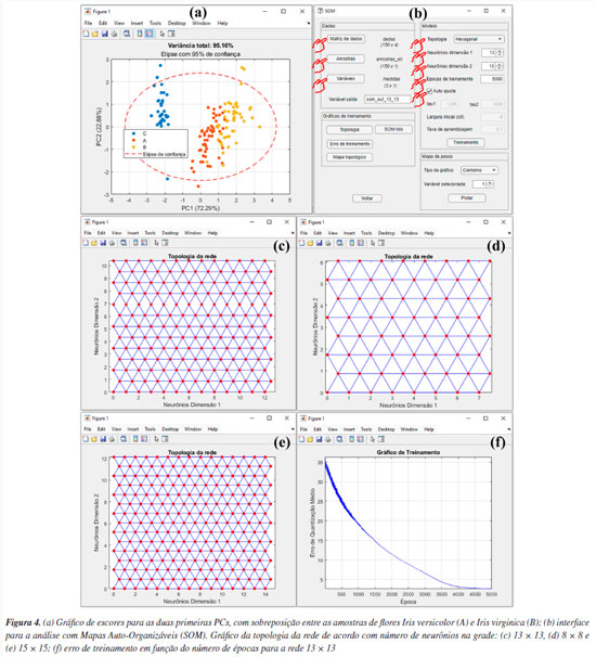 Para gerar o modelo de aprendizagem, aperte o botão "SOM" na janela "Análise Exploratória" do GAMMA-GUI. Após essa etapa, uma janela semelhante à Figura 4b se abrirá, e, nesta janela, os usuários precisam definir os inputs para realizar a análise, definindo a matriz de dados e os vetores que identificam as amostras e variáveis na interface do aplicativo, através dos botões "Matriz de dados", "Amostras" e "Variáveis", semelhante ao procedimento descrito anteriormente na seção da PCA. Após apertar o botão "Matriz de dados", a matriz "dados" deve ser selecionada, no botão "Amostras", selecionar "amostras_ab" e, em "Variáveis", selecionar "medidas". Em seguida, os usuários precisam definir alguns parâmetros específicos do SOM, como o tipo da topologia da rede usando o botão "Topologia", número de neurônios em cada uma das dimensões da rede, em "Neurônios dimensão 1" e "Neurônios dimensão 2", a quantidade de épocas de treinamento, em "Épocas de treinamento", e, por fim, marcar a caixa "Auto ajuste", de acordo com a Figura 4b. Para usuários mais experientes, ao desmarcar a caixa "Auto ajuste", outros parâmetros podem ainda ser ajustados. Para mais detalhes destes parâmetros, os leitores podem consultar Haykin.51 Por exemplo, a taxa de aprendizagem da rede, na caixa "Taxa de aprendizagem", é um parâmetro que controla o quanto os pesos dos neurônios são ajustados em cada iteração. Segundo Haykin,28 é recomendável usar uma taxa de aprendizagem inicial com um valor próximo de 0,1; portanto, o GAMMA-GUI tem como default esse valor de taxa de aprendizagem. Agora é hora de realizar a análise dos dados, apertando o botão "Treinamento", que, após finalizada, fornecerá uma estrutura de saída que renomeamos para "som_out_13_13". A fim de poupar o tempo de análise dos dados, neste material de demonstração os usuários têm acesso aos resultados de três opções de saídas de rede, em diferentes configurações, nomeadas como: "som_out_8_8", "som_out_13_13" e "som_out_15_15", que correspondem às topologias de dimensões 8 × 8, 13 × 13 e 15 × 15, respectivamente (Figuras 4c, 4d e 4e). Nestes gráficos, os pontos vermelhos representam os neurônios distribuídos na grade, enquanto as linhas azuis indicam as conexões de vizinhança entre eles. No interior da grade, cada ponto (neurônio) se conecta aos seus vizinhos que os cercam, formando uma estrutura chamada topologia. Neste caso, hexagonal, pois o padrão resultante se assemelha a hexágonos. No entanto, nas bordas e nos cantos da grade, os neurônios possuem menos conexões, pois nem todos os seis vizinhos estão disponíveis. A mesma linha de raciocínio é válida para a topologia retangular. Conforme antecipado, definir os parâmetros do SOM na maioria das vezes, não é uma tarefa trivial e pode exigir uma série de tentativas, mas algumas abordagens facilitam na sua definição, conforme demonstraremos. Durante a escolha da topologia da rede, os usuários devem priorizar uma estrutura de grade hexagonal se os dados tiverem uma distribuição mais isotrópica, ou escolher uma estrutura de grade retangular se os dados tiverem uma distribuição mais linear. Neste exemplo, escolhemos a topologia hexagonal, pois conforme vimos anteriormente, a PCA (técnica linear) não foi suficiente para diferenciar com clareza as três espécies de flores, ver Figura 4a. Outro parâmetro que deve ser ajustado é a quantidade de neurônios na grade, o que altera o tamanho da rede. Esse ajuste deve ser feito testando diferentes quantidades de neurônios. Uma boa opção é iniciar a análise usando uma quantidade de neurônios próximo ao número de amostras. Neste caso, temos 150 amostras, portanto, iniciaremos os testes com uma rede bidimensional 13 × 13. Ao apertar o botão "Topologia", após o treinamento da rede, os usuários podem gerar o gráfico da topologia da rede, que, neste caso, consiste em uma rede com 169 neurônios (Figura 4c). Para verificar se o tamanho da rede é ideal, os usuários podem comparar os comportamentos de distribuição das amostras com redes menores ou maiores (conforme veremos adiante). Neste caso, comparamos os resultados com uma rede 8 × 8, que contém 64 neurônios (Figura 4d), e uma rede 15 × 15, que contém 250 neurônios (Figura 4e). Após a etapa de treinamento da rede, os usuários podem gerar o gráfico de erro de treinamento da rede usando o botão "Erro de treinamento" (Figura 4f). Além das opções gráficas, os usuários podem acessar uma série de outros resultados da análise nas estruturas de saída dos dados, neste caso nomeadas como "som_out_8_8", "som_out_13_13" e "som_out_15_15", disponíveis no material demonstrativo deste tutorial. O gráfico de erro de treinamento auxilia os usuários na definição do número de épocas de treinamento, ou seja, o número de vezes que o conjunto de dados de treinamento é apresentado à rede. Ao utilizar um número elevado de épocas, a rede pode sofrer overfitting, memorizando os dados de treinamento em vez de aprender novos padrões, diminuindo a capacidade de generalização. Se o número de épocas for baixo, pode ocorrer o underfitting.28,53 Na rede 13 × 13 testada, o erro de quantização no gráfico decresce com o aumento do número de épocas (Figura 4f), e, após 4000 épocas, o erro de quantização atinge um estado estacionário. Esse platô no gráfico indica que os neurônios no mapa estão próximos de representar corretamente os padrões de entrada observados. Portanto, as 5000 épocas definidas na caixa "Épocas de treinamento" foram suficientes para esse conjunto de dados. Caso um platô não seja atingido, seria apropriado considerar o treinamento de uma nova rede com um número maior de épocas. Por outro lado, se um platô for alcançado com menos épocas, os usuários podem optar por utilizar menos épocas, resultando em uma redução considerável no tempo de treinamento da rede. O mapa topológi