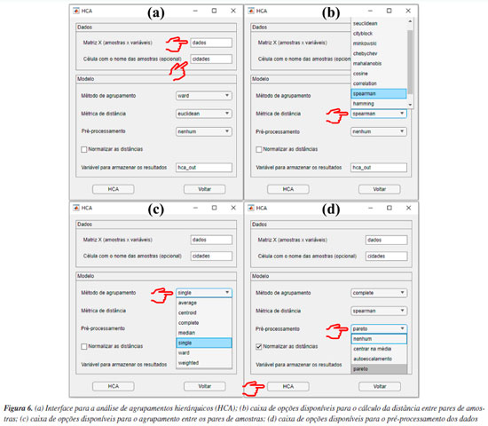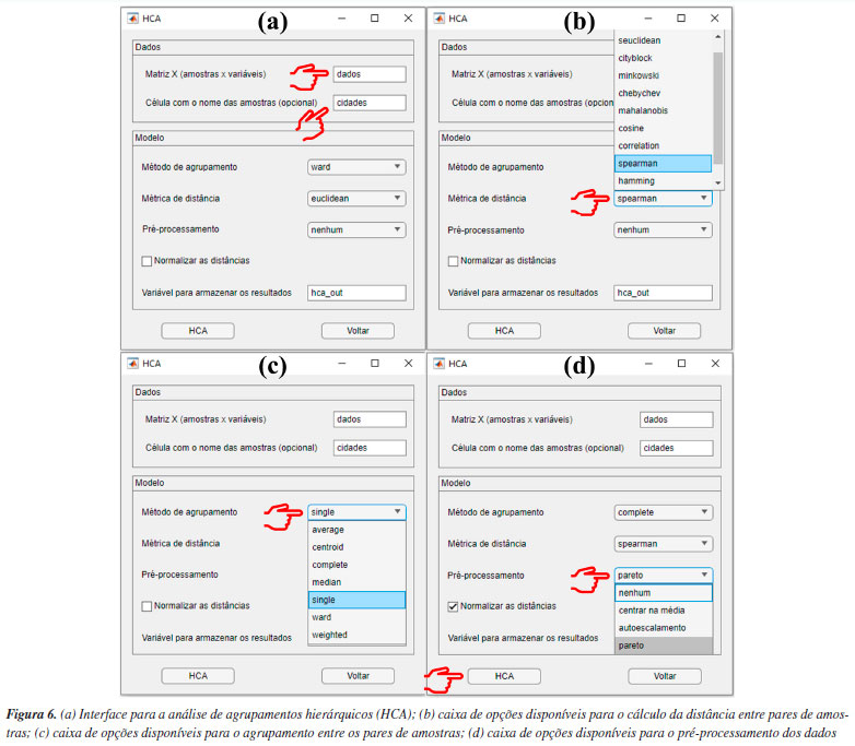 Analisando os mapas de pesos das Figuras 5a-5d, observa-se que as amostras de Iris setosa (C) na maioria dos casos exibem pesos menores em comparação com as amostras de Iris versicolor (A) e Iris virginica (B), enquanto as amostras de Iris virginica (B), por sua vez, demonstram pesos superiores às amostras de Iris versicolor (A). Essa distribuição heterogênea dos pesos no mapa para cada classe de amostras de flores significa que as quatro variáveis podem influenciar na formação dos clusters. No entanto, é notável que, entre as quatro variáveis analisadas, a largura e o comprimento da pétala foram as variáveis mais importantes. Isso é possível ao observar a escala de cores, para diferenciar claramente as três espécies de flores Iris. Tal comportamento não é observado para a largura da sépala (Figura 5b), uma vez que, segundo a escala de cores, não é possível evidenciar com clareza a diferenciação entre as espécies de flores. Uma abordagem alternativa consiste em realizar o treinamento de uma nova rede utilizando as mesmas configurações, porém removendo a variável "largura da sépala" do conjunto de dados para tentar melhorar a diferenciação entre as amostras. Tal abordagem também é aplicada na PCA, quando uma variável prejudica a diferenciação das amostras. De acordo com a Figura 4S (Material Suplementar), observa-se que, ao utilizar o conjunto de dados "som_out_13_13_sem_var2", isto é, a coluna da matriz que corresponde à largura da sépala, o perfil de diferenciação entre as três espécies de Iris teve uma ligeira melhora comparada à análise anterior. Para concluir esta seção, gostaríamos de ressaltar que a inclusão do SOM neste tutorial tem como principal objetivo apresentar uma alternativa entre várias possíveis para a análise exploratória de dados, podendo complementar a PCA. Nosso foco é mostrar como executar e interpretar os resultados do SOM, uma abordagem ainda pouco usual na quimiometria. Isso não significa que o SOM seja melhor ou pior do que a PCA. Neste exemplo, os resultados foram semelhantes, mas o SOM pode ser uma opção interessante para testes adicionais, especialmente em casos em que a PCA não seja suficientemente informativa. HCA Utilizamos, neste exemplo um conjunto de dados composto por 20 variedades de soja (Glycine max (L.) Merrill), desenvolvidas pela EMBRAPA-Soja e recomendadas para o plantio na região Centro-Sul do Brasil. As 20 amostras de soja foram simultaneamente cultivadas em Londrina e Ponta Grossa, totalizando 40 amostras que foram quantificadas quanto à composição inorgânica (K, P, Ca, Mg, S, Zn, Mn, Fe, Cu e B) por ICP-OES (do inglês, inductively coupled plasma optical emission spectroscopy). Mais detalhes podem ser obtidos em Cremasco et al.53 Durante o experimento, as plantas foram submetidas às mesmas condições de fertilização e tratamento de irrigação, embora as duas cidades tenham características distintas de clima, terreno e temperaturas. Utilizando a diversidade do conjunto de dados, verificaremos a capacidade de agrupamentos das amostras usando HCA com base no perfil mineral, considerando a localização geográfica do cultivo. Esse conjunto de dados consiste em 40 amostras, igualmente distribuídas entre Londrina e Ponta Grossa, com 10 elementos determinados, resultando em uma matriz X de dimensões 40 × 10, disponível em "dados_soja" e YouTube.55 Ao carregar o material de demonstração, os usuários têm acesso à matriz "dados", que consiste nos valores obtidos para os 10 elementos quantificados em cada amostra. Além disso, há um vetor que contém as cidades de plantio de cada amostra, denominado "cidades", e um vetor com os símbolos dos elementos químicos determinados, chamado "var". A próxima etapa envolve a definição dos inputs da HCA na interface "HCA" disponível na janela "Análise Exploratória" do GAMMA-GUI. Nesta nova interface, os usuários devem inserir o nome da matriz "dados" na caixa "Matriz X (amostras × variáveis)" e o vetor contendo os nomes das amostras, denominado "cidades", na caixa "Célula com o nome das amostras (opcional)", conforme mostrado na Figura 6a.