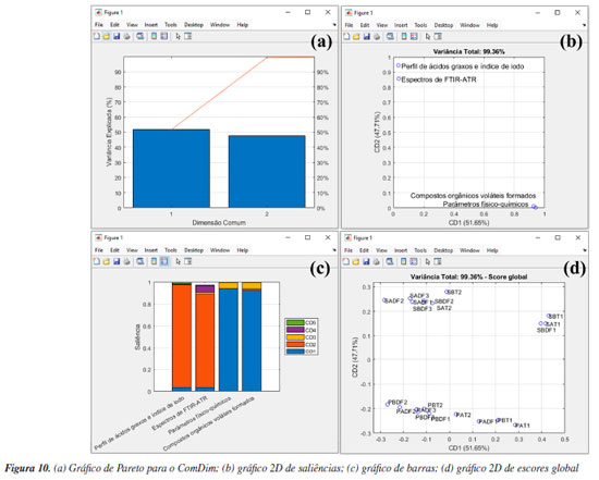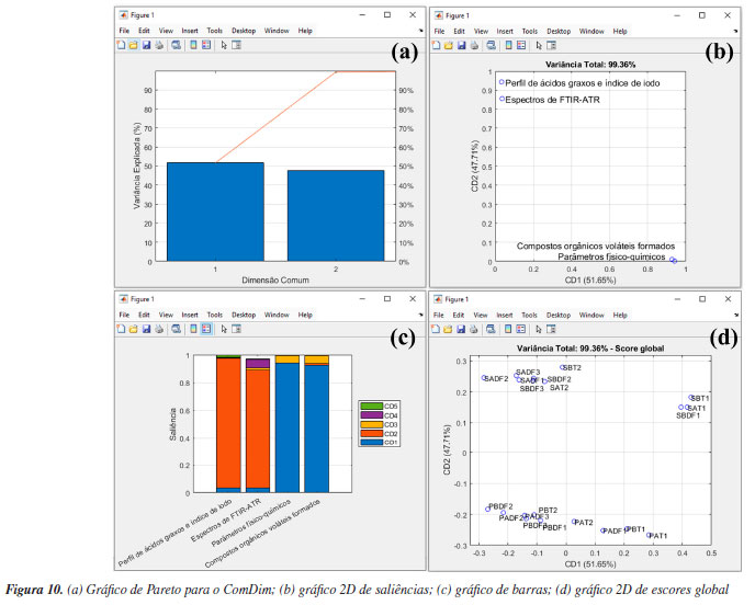 Para o preenchimento da interface "ComDim - Estrutura de dados", os usuários devem seguir as instruções de preenchimento na própria janela. Nesta tabela, é opcional o preenchimento da caixa "Nome da tabela", na qual os usuários podem nomear cada conjunto de dados que será inserido na estrutura "comdim_in", criando suas próprias nomenclaturas. É fundamental salientar que cada conjunto de dados deve obedecer à mesma ordem em todas as demais caixas preenchidas. Neste exemplo, adotamos a seguinte nomenclatura e ordem: "Perfil de ácidos graxos e índice de iodo", "Espectros de FTIR-ATR", "Parâmetros físico-químicos" e, por fim, "Compostos orgânicos voláteis formados". Outra opção de preenchimento opcional é a caixa "Nome das variáveis (opcional)". Nesta caixa, os usuários podem identificar as variáveis, ou seja, fornecer os nomes das colunas de cada conjunto de dados. Neste caso, temos três vetores que incluem os nomes das colunas e um vetor com os valores correspondentes aos números de onda dos espectros de FTIR. Seguindo a ordem previamente estabelecida, iniciamos definindo o vetor que contém os nomes dos perfis de ácidos graxos determinados, digitando "FAP_var". Posteriormente, definimos o vetor com os comprimentos de onda, digitando "FTIR_var". Em seguida, especificamos o vetor que contém os nomes dos parâmetros físico-químicos determinados, digitando "PC_var" e, finalmente, o vetor com os nomes dos compostos orgânicos voláteis formados, digitando "VOC_var". Na etapa final da geração da estrutura, os usuários devem definir as matrizes correspondentes a cada conjunto de dados na caixa "Matriz de dados (amostra × variáveis)". Nessa caixa, é necessário inserir os nomes "FAP", "FTIR", "PC" e "VOC", conforme exemplificado na Figura 9b. Após a definição dos inputs requeridos, é hora de gerar a estrutura "comdim_in" apertando o botão "Gerar estrutura", que logo aparecerá no workspace do Matlab. Acessando a estrutura "comdim_in", os usuários têm disponível informações acerca das amostras, vetores das variáveis e matrizes de dados. Uma vez gerada a estrutura de dados, não há mais necessidade de realizar novamente este procedimento, caso os conjuntos de dados permaneçam inalterados. Agora é hora da análise dos dados, para isso, basta eleger o critério de escolha do número de dimensões comuns (CDs), que pode ser "Calcular todas as CDs" ou definir a quantidade de CDs na caixa "CDs". Neste exemplo, definimos o número de CDs igual a cinco. Não é recomendável o cálculo de todas as CDs para matrizes muito grandes, pois o cálculo computacional pode ser demorado e dificilmente será necessária a análise de todas as CDs. Por fim, é preciso ainda escolher o algoritmo para a decomposição dos dados usando o botão "Algoritmo", que conta com três opções disponíveis: uma por "PCA", uma por "CCA" e outra por "ICA". Para mais detalhes sobre cada uma destas opções, os leitores podem consultar Bouveresse e Rutledge.35 Neste exemplo, utilizaremos a opção "PCA" e ainda marcaremos a caixa "Calcular correlações" para obter os valores de correlações entre as CDs. Por fim, devemos apertar o botão "ComDim". Durante a escolha do número de CDs e obtenção das correlações, é recomendável que os usuários considerem usar a opção que possibilita definir uma quantidade de CDs, e ainda desmarcar a opção para os cálculos de correlações, caso os conjuntos de dados sejam grandes. Caso contrário, dependendo da capacidade de processamento do computador o tempo de análise dos dados pode ser considerável. Após finalizar a análise dos dados uma estrutura chamada "comdim_out" (nome de default) será gerada no workspace do Matlab. Nesta estrutura, os usuários têm acesso a uma série de resultados da análise, como o algoritmo escolhido em "metodo", número de CDs em "CDs", os dados analisados em "data", a matriz de correlação em "correlacoes" e, por fim, a estrutura "model". Na estrutura "model", os usuários têm acesso a diversos resultados, tais como a matriz de Frobenius em "Xn_mat", a variância explicada em "variancia", as saliências individuas em "saliencias", e a soma das saliências em cada CD e tabela em "Soma_sal_dim" e "Soma_sal_tab", respectivamente. A matriz "ValSing" contém os valores singulares (autovalores), na matriz "T", os valores de escores globais, em "P", os pesos globais normalizados e, em "L", os pesos globais não normalizados, enquanto as estruturas "Tlocal", "Plocal" e "Llocal" contém os escores e pesos de cada conjunto de dados individual. É fundamental esclarecer que, no ComDim, cada CD extraída possui um conjunto de saliências, escores e pesos. A saliência é o peso/contribuição atribuído a cada bloco para a construção de uma CD específica, que também pode ser interpretada como a variância do bloco representada naquela CD. Já os escores são as projeções das amostras no espaço comum da CD, e os loadings são os pesos das variáveis contidas em cada bloco, tendo uma interpretação análoga à da PCA.34 Na interface do ComDim, os usuários têm acesso a diversos recursos gráficos. Para iniciar a análise dos resultados, pressionaremos o botão "Pareto" para gerar o gráfico de Pareto (Figura 10a). Semelhante ao gráfico de Pareto da PCA, no ComDim, esse gráfico, juntamente com o gráfico de Scree, oferecem aos usuários a capacidade de determinar o número ideal de CDs a serem consideradas no estudo. Neste exemplo, inicialmente optamos por avaliar as cinco primeiras CDs. No entanto, ao analisar o gráfico, observamos que as duas primeiras CDs foram suficientes para representar 99,36% da variância nos quatro blocos de dados, com 51,65% da variância representada na CD1 e 47,71% na CD2.
