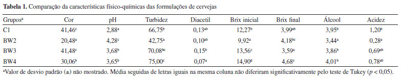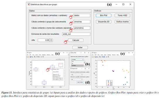Dentro da estrutura de dados gerada, os usuários têm acesso à matriz de correlação, acessando "Correlação", e diversos outros resultados em "Resultados", tais como ANOVA, Tukey e letras para facilitar a comparação entre os grupos do teste de Tukey HSD. Além disso, existe uma série de outros recursos gráficos que os usuários podem utilizar, como o gráfico "Box-Plot", "Tukey HSD", "Dispersão 2D" e "Gráfico Aranha". As Figuras 11b e 11c mostram o gráfico boxplot iterativo que pode ser gerado para cada parâmetro, no qual, ao clicar sobre cada barra, é possível obter algumas métricas, como os valores de mediana, máximo, mínimo, entre outros. Além disso, há ainda o gráfico de dispersão (Figuras 11d e 11e), que permite avaliar a correlação entre os parâmetros. Outras opções de visualização compreendem os gráficos de aranha e Tukey HSD (Figura 7S, Material Suplementar). Durante a criação do gráfico de aranha (Figuras 7Sa e 7Sb), os usuários têm diversas possibilidades de personalização, como selecionar variáveis ou grupos de amostras específicas, marcando as caixas de preenchimento disponíveis na interface. Por fim, nas Figuras 7Sc e 7Sd, é mostrado o gráfico iterativo de Tukey HSD, onde os usuários podem verificar graficamente se os pares de médias em um conjunto de grupos são significativamente diferentes entre si. Tomamos como o exemplo o parâmetro "Cor", se o usuário clicar em um grupo específico na área do gráfico, verificará que o resultado fornecido no eixo x pode mudar de grupo para grupo. Neste caso, o resultado para o grupo C1 no parâmetro "Cor" indica que dois grupos possuem médias significativamente diferentes em relação a este grupo. Caso o usuário deseje ainda criar a tradicional tabela do teste de Tukey HSD, rotulando as letras para facilitar a identificação, os resultados podem ser acessados em "Grupos", dentro da estrutura "Resultados", ver Tabela 1.
