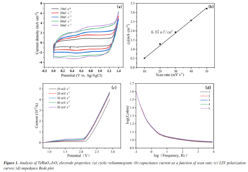 RESULTS AND DISCUSSION Electrode performance analysis The CV curves of the electrodes at various scan rates are displayed in Figure 1a. After five cycles with varying sweep speeds, the electrode retains the matrix characteristics of the ideal capacitance, and the Ti/RuO2-IrO2 anode does the same without redox peaks. Additionally, the area of the Ti/RuO2-IrO2 electrode curve grows with an increase in sweep rate, indicating an increase in the active surface area of the Ti/RuO2-IrO2 electrode, while the cyclic voltammetry curve practically stays the same after each cycle. As a result, the capacity of the electrode for catalytic oxidation is increased, leading to a greater number of active sites and the generation of numerous active compounds.24 The oxidative capability of the active ingredient is inhibited by oxygen evolution reaction (OER), and OER is more difficult to occur when the oxygen evolution potential is higher.24 The LSV curves of the electrodes at various scan rates are displayed in Figure 1c. The oxygen evolution potential of Ti/RuO2-IrO2 is 2.26 V. This effectively suppresses the OER, minimizing its interference during degradation and enhancing the efficiency of the electrode in catalyzing organic oxidation. At frequencies ranging from 0.01 to 10,000 Hz, electrochemical impedance experiments were conducted in the three-electrode setup. Figure 1d demonstrates that in the high frequency range (10-10000 Hz), the electrode impedance mode stays constant as the frequency rises, exhibiting only minor variations as the number of reactions increases. The aforementioned findings demonstrate the extended service life of the electrodes.