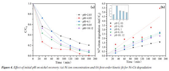 Effect of initial pH It is also known that the pH of the initial solution has a significant impact on oxidative complex breakdown and Ni recovery. The solubility product constant (Ksp) of Ni(OH)2 is 5.48 × 10-16, and the equivalent Ni(OH)2 form is generated when the pH of the solution exceeds 7.87.22 As indicated in Figure 4a, the greatest nickel recovery of 99.6% was obtained at an initial pH of 4.09. The high concentration of active chemicals at the anode surface may break the network, releasing additional Ni2+ into solution and reducing it to metallic nickel bound to the cathode stainless steel.27 Nickel recovery was approximately 90% in the pH range of 6.1-10.12, somewhat lower than in an acidic environment with a pH of 4.09. This could be because in an alkaline environment, more OH- is adsorbed on the anode surface, covering the electrochemically active sites and oxidizing to form O2. This competes with the development of the main reactive groups of the system. However, the recovery of nickel ions was dramatically reduced in an extremely acidic environment at pH = 2.03, with a recovery rate of only 79.5%. The most likely explanation is that H+ reduction is predominantly a cathodic reaction, with excess H+ decreasing the overpotential for H2 release at the starting pH,28 resulting in poor nickel recovery under severely acidic conditions. First-order dynamics with a pseudo-first-order rate constant (k) provide additional description. As indicated in Figure 4b, the maximum value of k (0.024 min-1) was found at pH = 4.09, and as pH increases, the k value decreases. The lowest k value (0.008 min-1) was recorded at pH 2.03, markedly lower than those observed at other pH levels. This provides additional support for the conclusions obtained above. In any case, electrochemical oxidation of Ni-Cit can take place throughout a wide range of initial pH (2.03-10.12) without considerably decreasing the oxidation efficiency of the method. In conclusion, to maximize nickel metal recovery efficiency, an appropriate pH (4.09) was chosen based on the current condition.